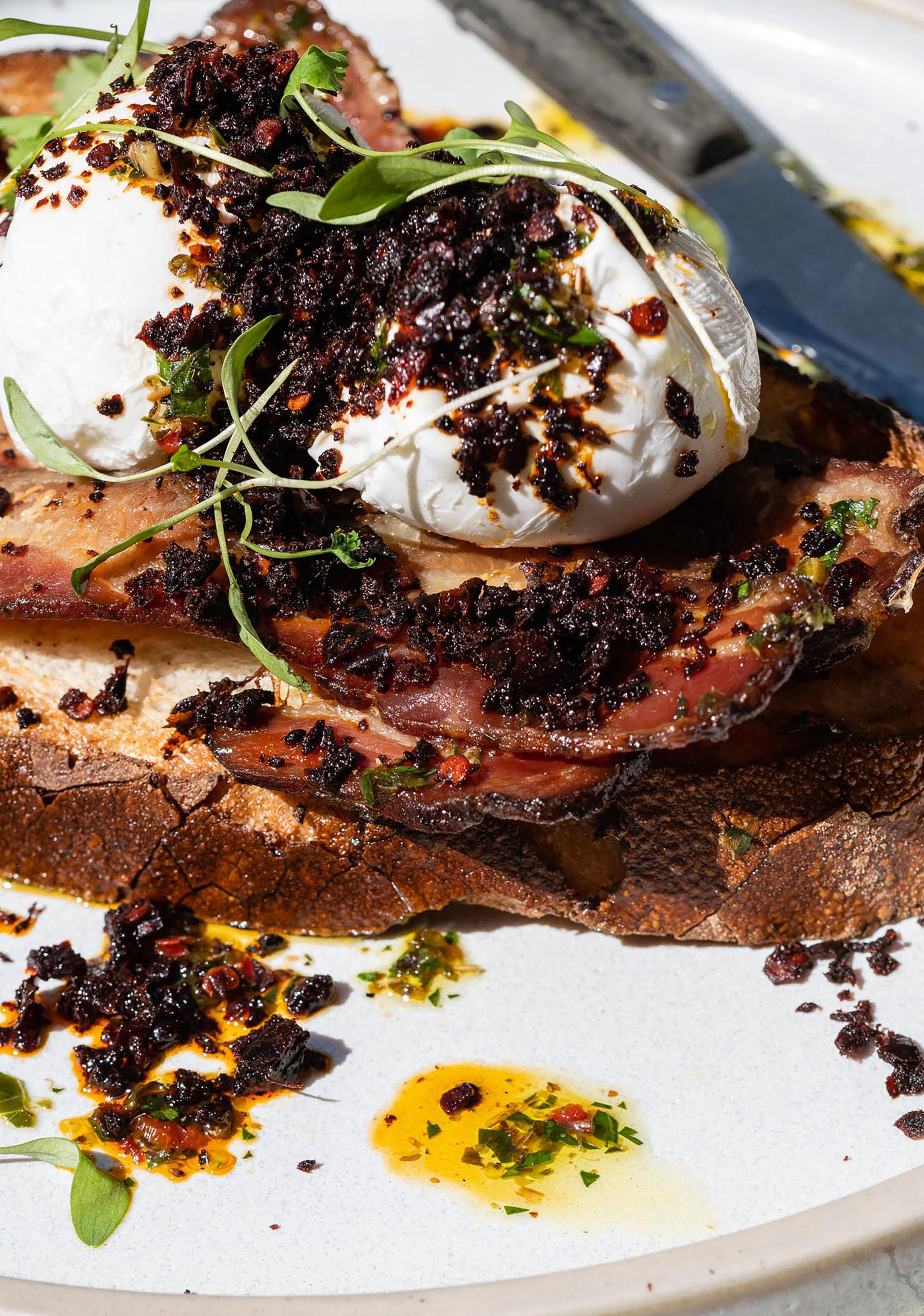 That French toast is excellent. The bread part is as rich and flaky as you would imagine from leftover pastries, served topped with fruit compôte, cream cheese spiked with lemon zest and crunchy sweet pumpkin seeds. And there is the superb breakfast brioche roll with fillings of topquality streaky bacon, fried egg, and potato rösti. A sriracha mayo mingles with the warm yolk, with spring onions for that green, toothsome sweet bite. It goes extremely well with a Bloody Mary. It also might be my favourite.