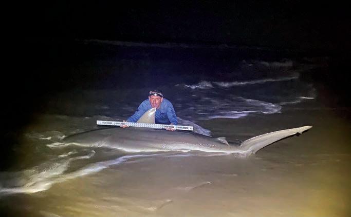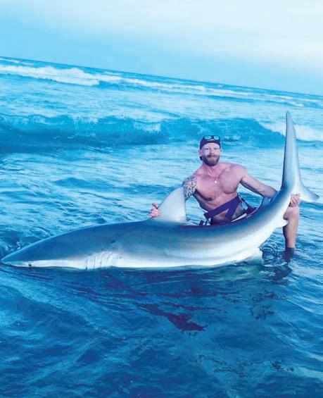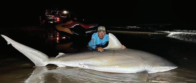 shape. Dusky anchovies will kick it off and get driven in acre-size baitballs right up to the beach. Mackerel, skipjacks, jackfish, tarpon, sharks and other predators will be attacking them. Best bet is throwing a topwater or large spoon to avoid as many of the numerous skipjacks as possible. Hundreds, if not thousands of birds diving to snatch victims of the frays will identify the places with fast action. When these baitballs do get pushed almost up on the sand, sharks will practically beach themselves gorging on the anchovies. Be careful and alert when wading, not just for sharks but also for stingrays, still present in big numbers. The majority of action in September will revolve around bait presence. Aside from targeting fish around baitballs, the earlymorning action on trout around structures should be steady on both topwaters and soft plastics. Shark fishing will pick back up, with blacktip and bull sharks retreating from the shrimpers and coming to the beaches to feast on the anchovies and other migrating forage species. Anyone heading to the beach this time of year should keep an eye on the weather.