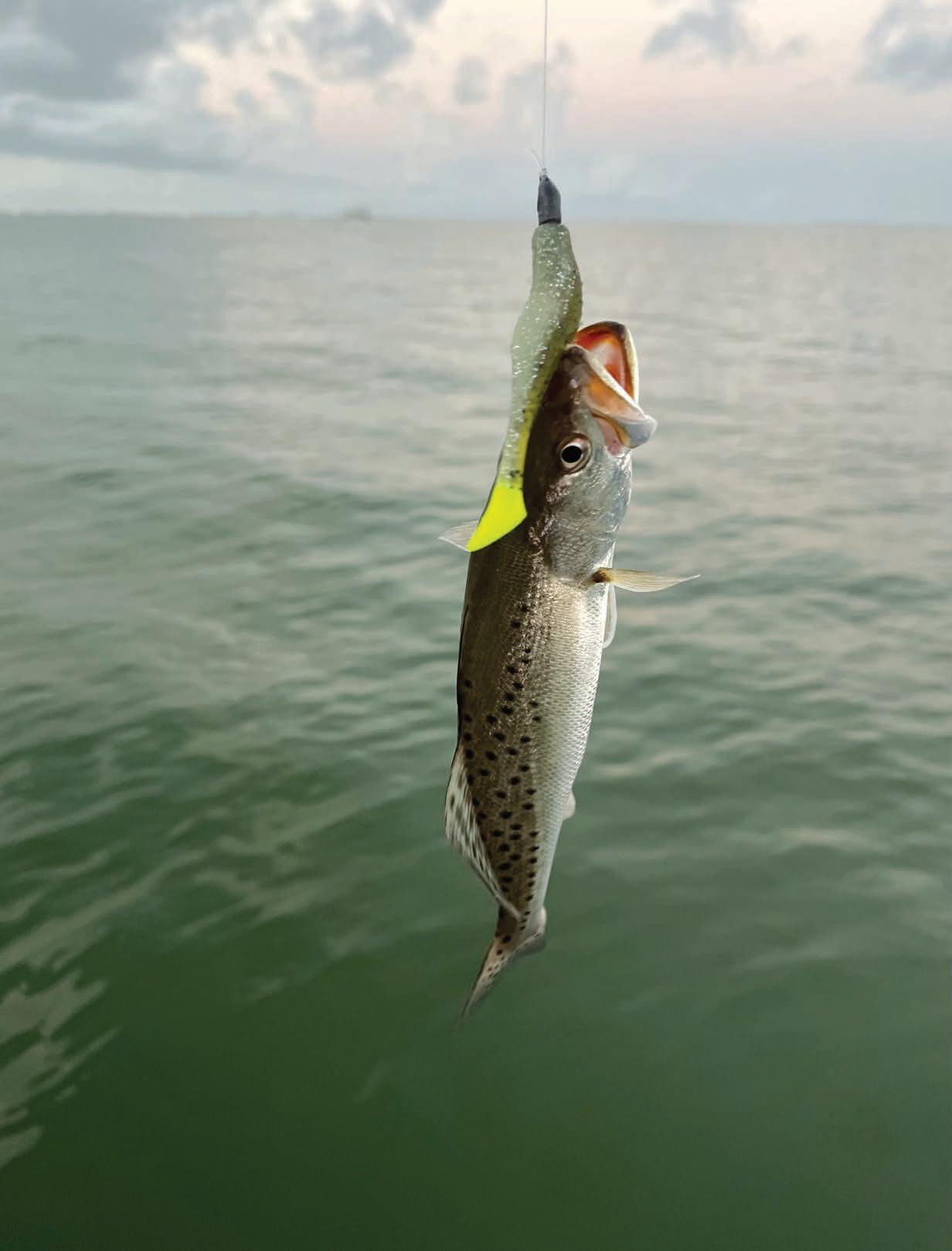 Tail Shad in Mansfield Margarita, Pollo Loco and Lagunaflauge are also productive. Closer to port, West Bay, Bennie’s Bar, the Pipeline and the Saucer are great areas. On the flats both north and south of the East Cut, redfish will be schooling in the shallows over sandy bottoms first thing in the mornings. Later, toward midday, they usually move to deeper water, following the schools of mullet. It’s hard to beat a gold weedless spoon when targeting the reds, but small topwaters also work well at times.