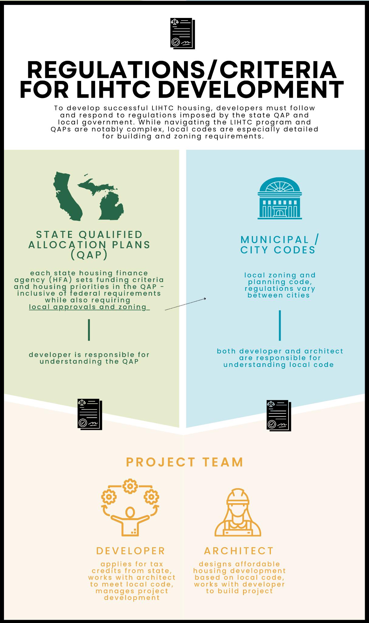 In this section, we will explore regulations as it relates to LIHTC development at the federal, state, and local levels. This is important for understanding the top-down guidance in the program and how the variety of regulations can affect how communities are built - along with how there may be an absence of public participation in the development process. Following this, the agency and responsibility of the developer in bringing in public input should be clear