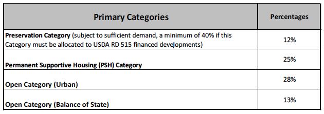 In contrast to CTCAC’s LIHTC development categories, MSHDA separates LIHTC funding priorities into four “Primary Categories”, as detailed in its 2022-2023 QAP: preservation, permanent supportive housing (PSH), open (urban) for areas that are neither preservation nor PSH, and open (balance of state) for all other areas On top of the primary category, projects may also fall under one or both of the two “Optional Categories”: strategic investment and disaster credits (MSHDA, 2023)