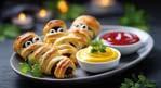 • Hot dogs • Crescent roll dough or pizza dough • Candy eyes or mustard/ketchup for eyes