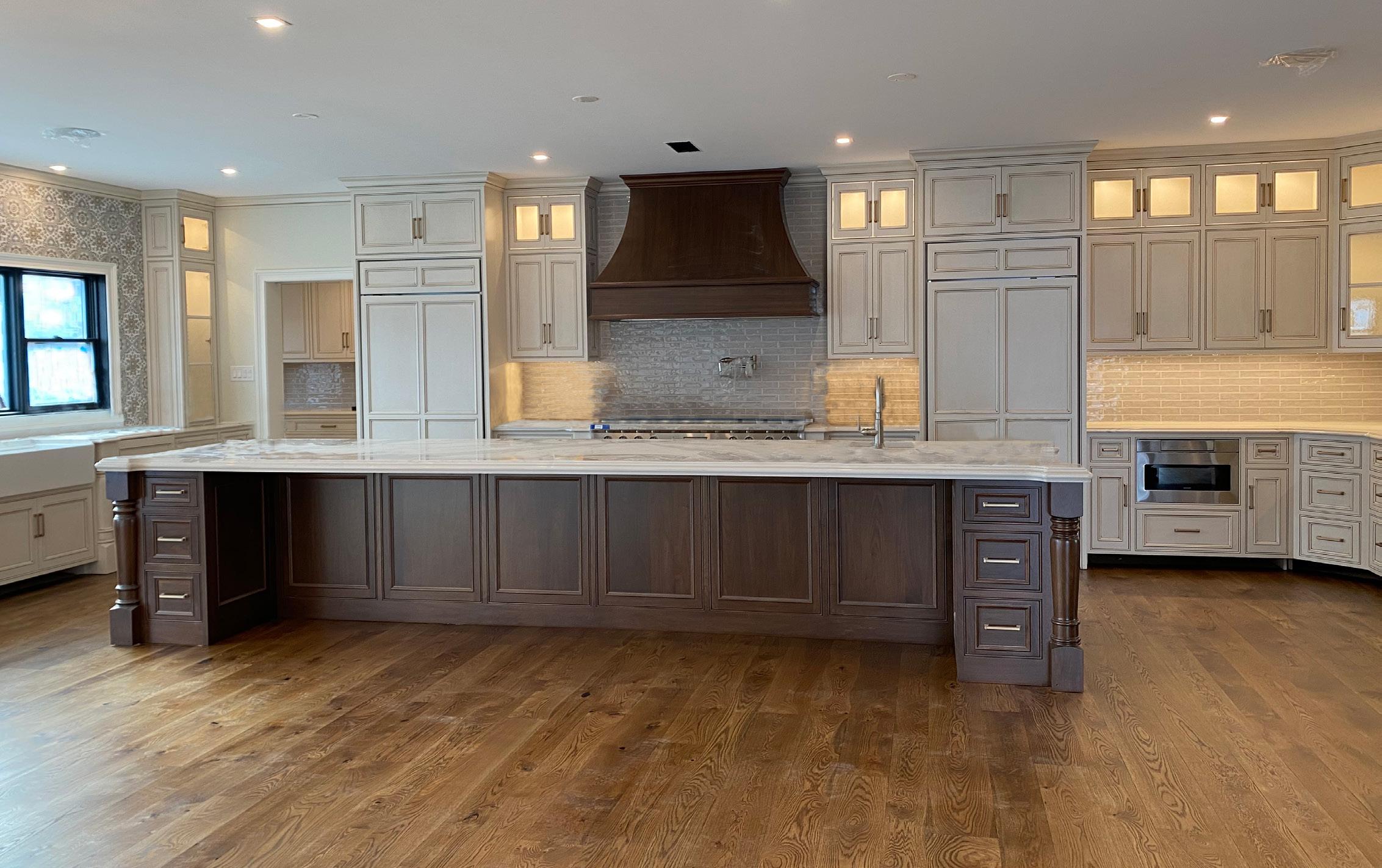 This custom kitchen features a 10-foot-wide waterfall island in the center of the space that allows for members of the family to gather. The island is a central point of the kitchen that creates balance and symmetry with the other amenities of the kitchen. The floor to ceiling pantry located towards the back of the island gives the kitchen a heightened appearance.