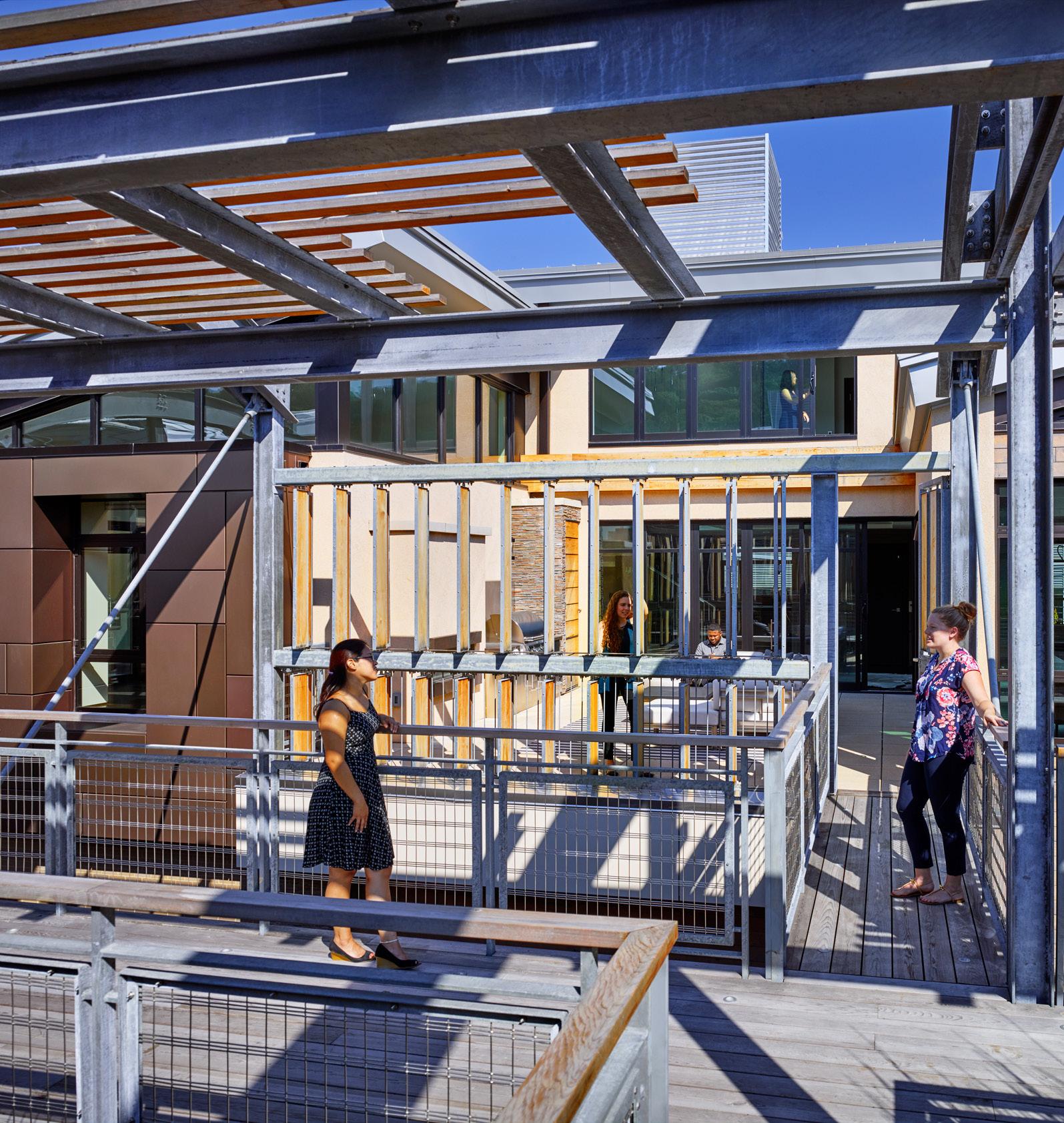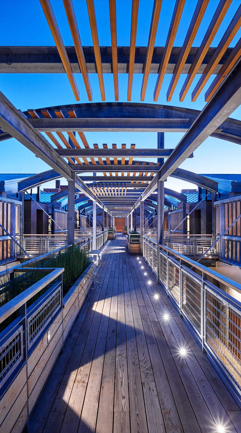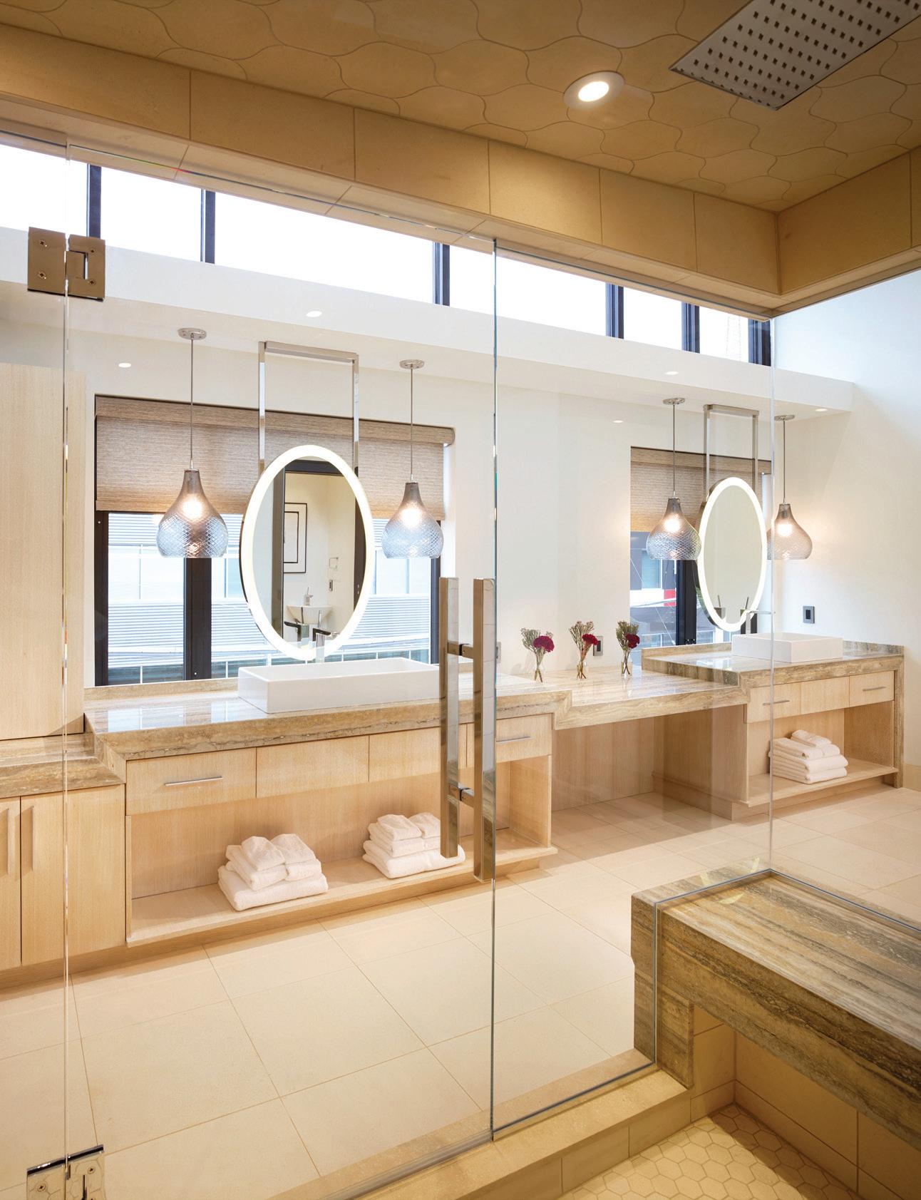 Spaces fan outward to accept the sunlight of southern windows, as well as featuring clerestory windows for more privacy. Copper is used as a rain screen and for the roof; its dark color carries through to the fixtures, such as the spa and tub, and is reflected in the bronze hardware throughout.