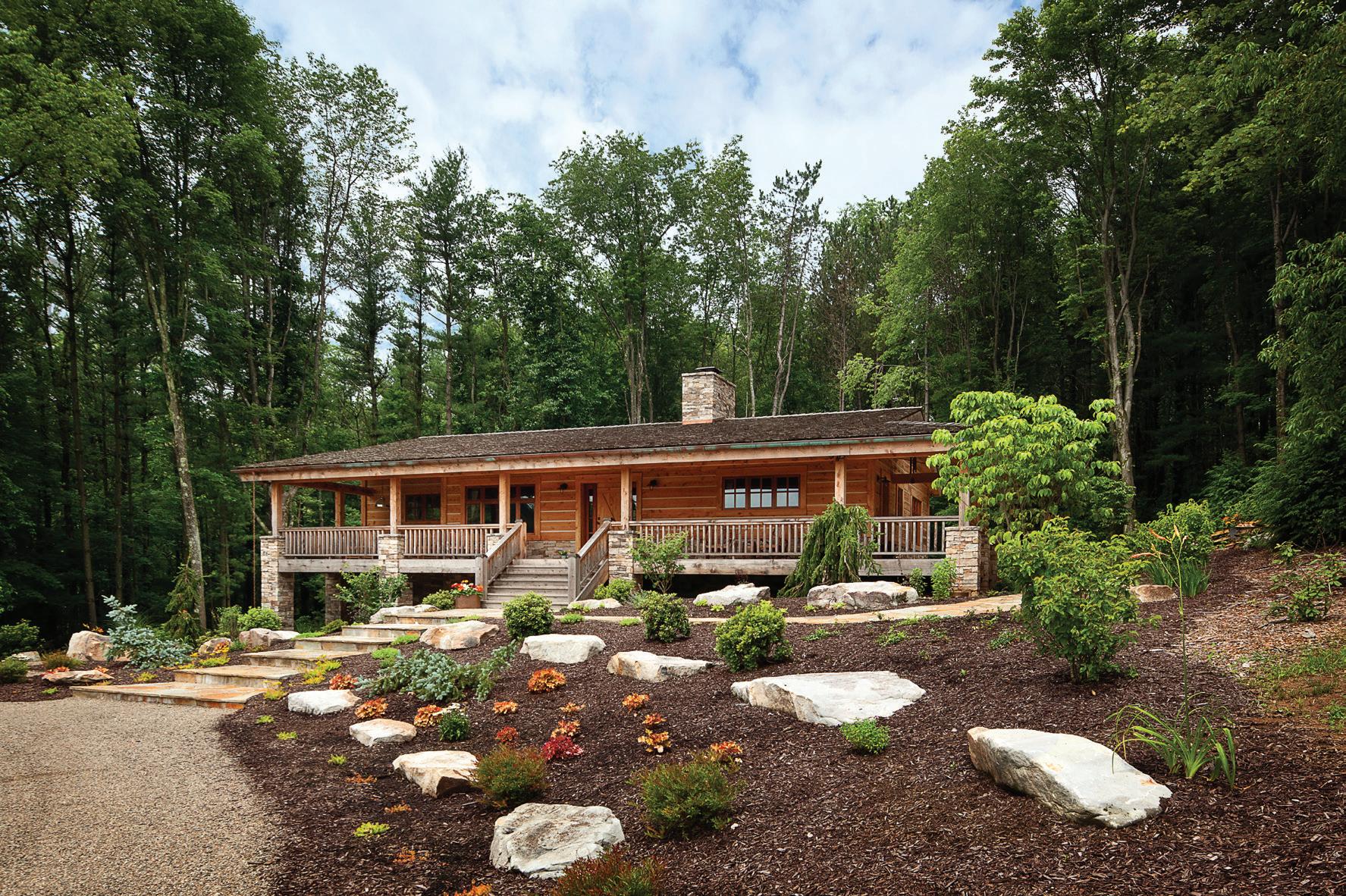 This 1,800-square foot guest house captures the cozy, rustic and honest feeling of a true log cabin through the log cabin architectural style. The home uses wood siding, stone piers, and a stone fireplace to echo nature, and features a large front porch so guests can engage with nature.
