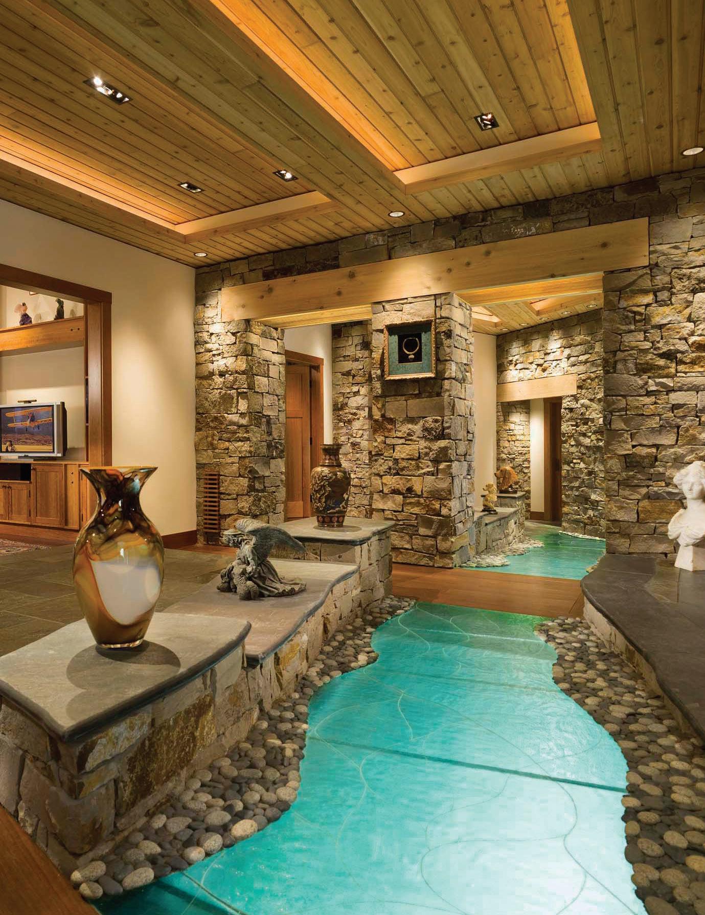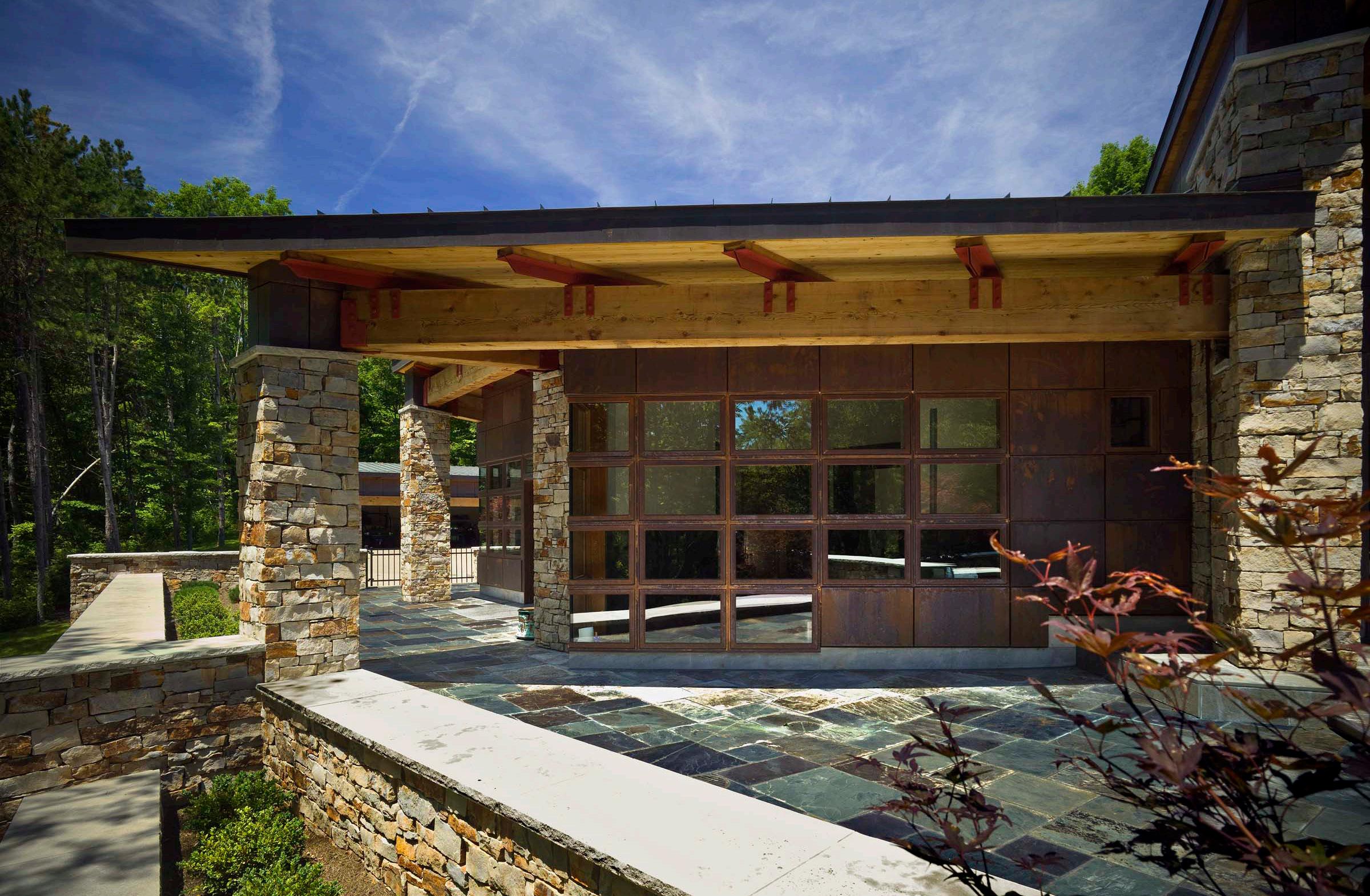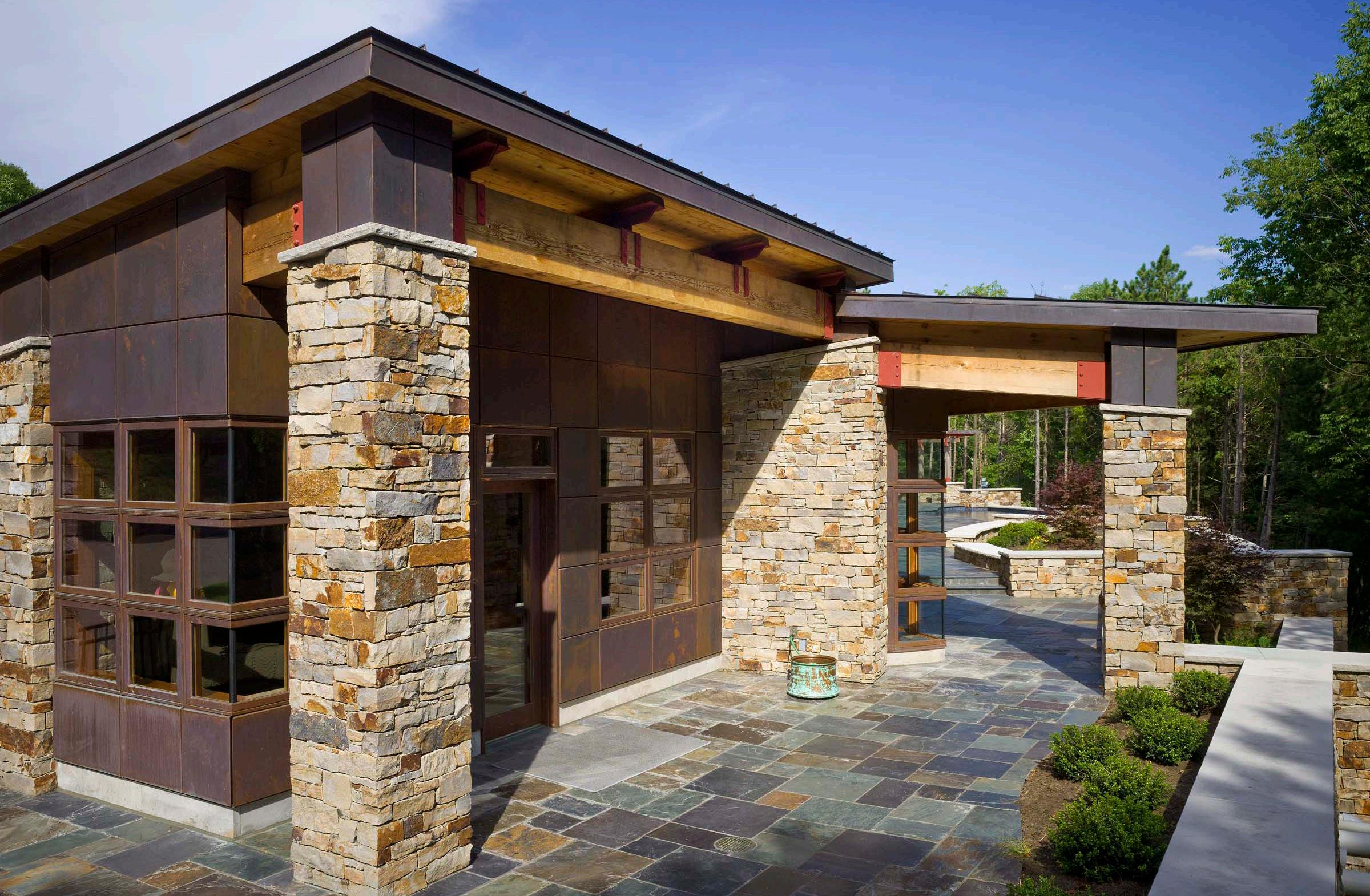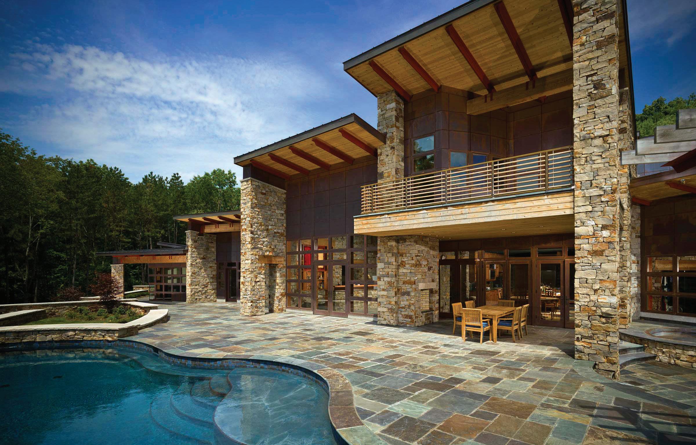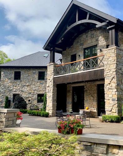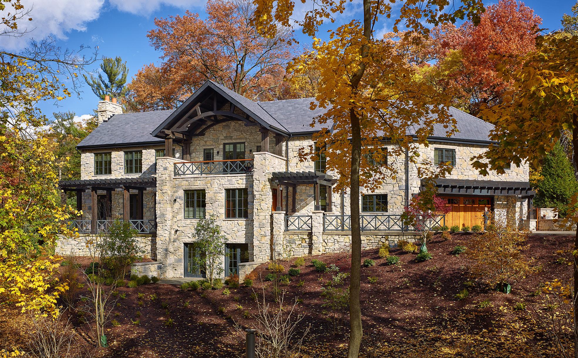 The natural stone makes the home feel as though it is nestled into the hillside, and rustic wood detailing gives the exterior a warm, personal touch. Lighter stone paired with a darker wood compliments the tones from the stone and allows the home to blend in with its natural surroundings.