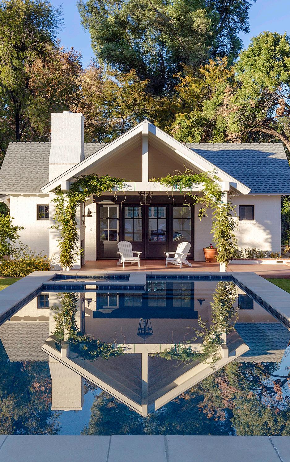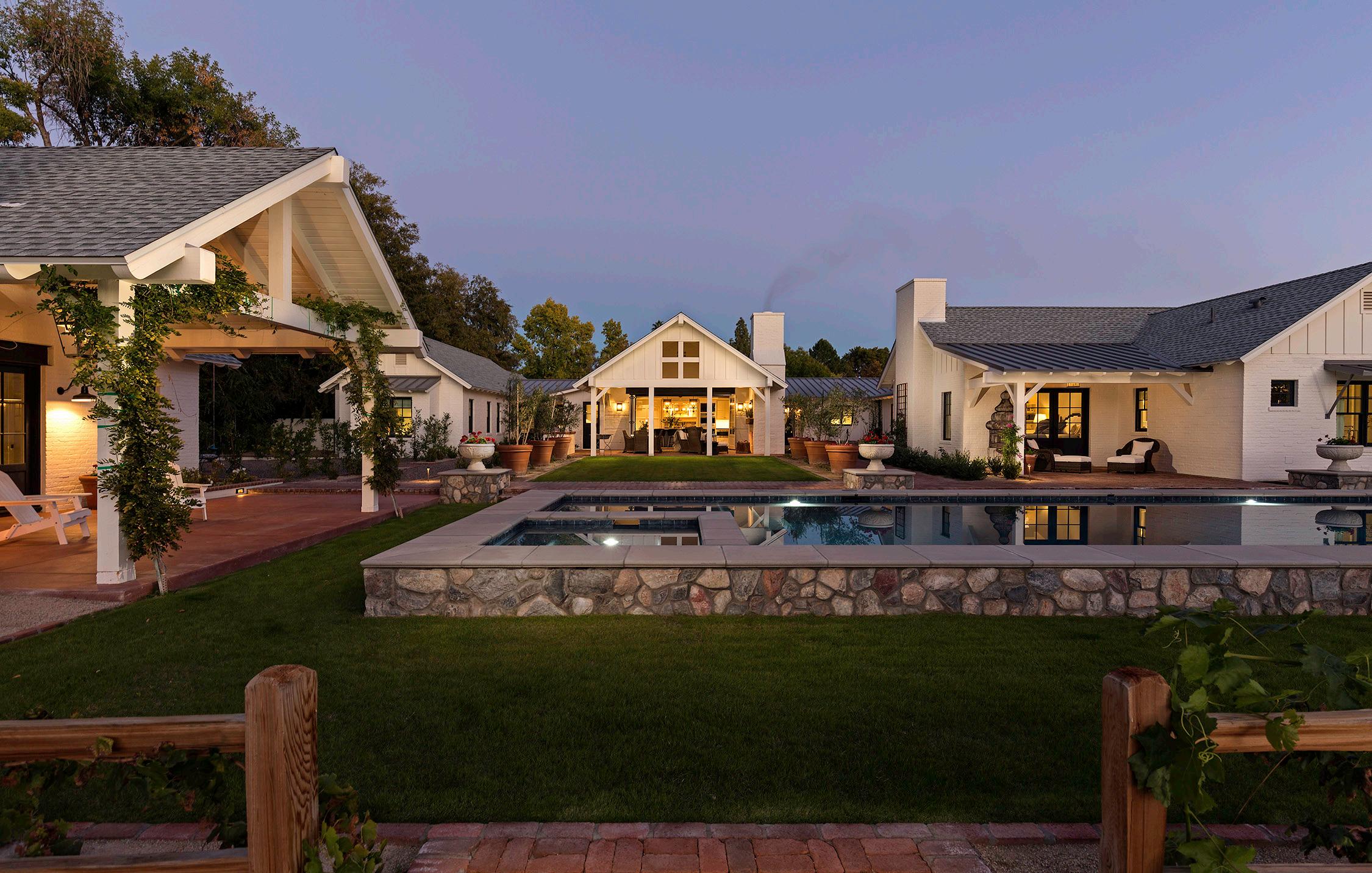 Set on a large irrigated lot, this 4 bedroom home was designed to evoke the agricultural history of the area. Although built in whole, the home was designed to appear as a conglomeration of gabled, brick outbuildings that were connected over time by lower sloping metal shed roofs. The main living volume is articulated with salvaged barn beams, giving the “original” home a unique depth and aged character. The “double-h” shaped floorplan allows many rooms to receive natural light on 3 sides. Large folding doors open the kitchen to an outdoor living room and the rear yard which features a raised pool and detached guest house / pool cabana. The master suite hallway incorporates brick flooring, a brick wall, barn doors and wood beams to give the illusion of an old covered porch that has been converted to interior space.