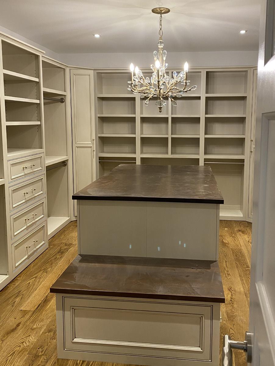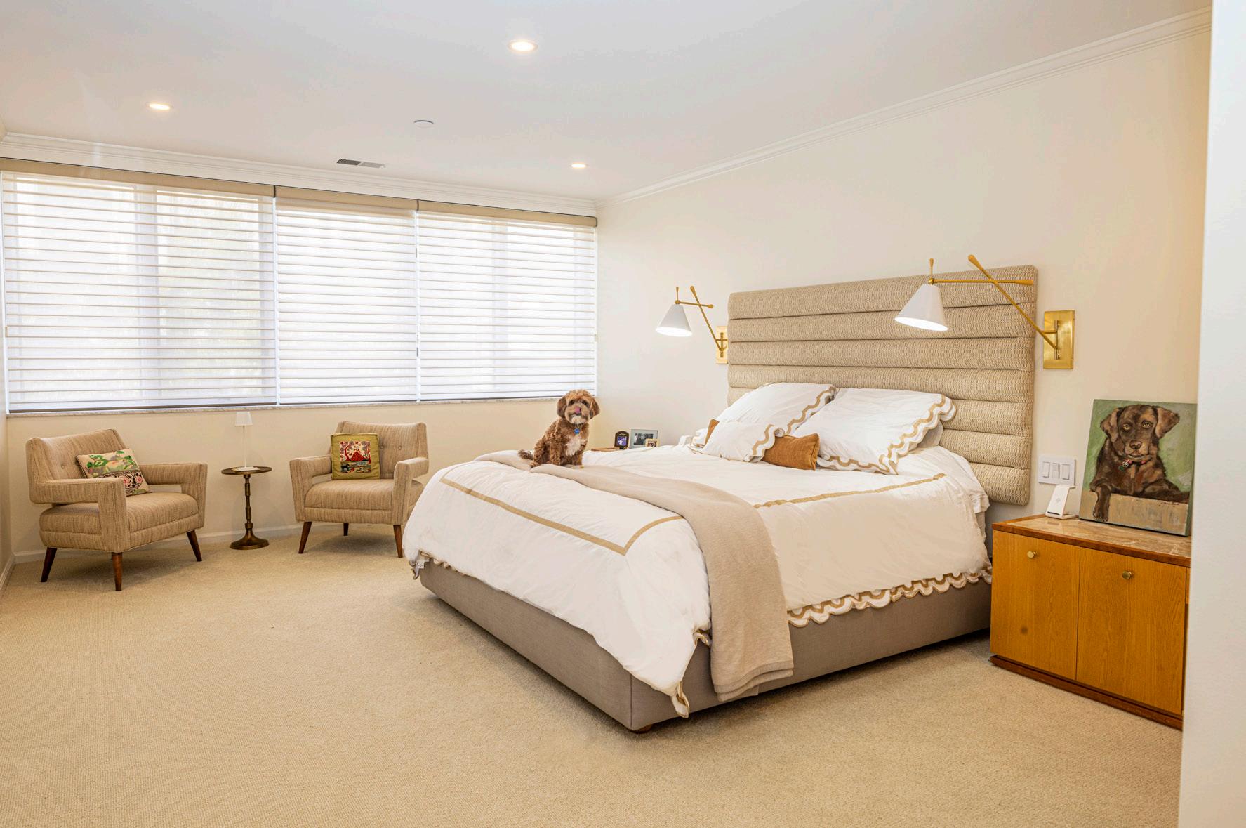 On the new upper level there are three suites to accommodate the client’s sons when they visit, each with closets and private baths. The primary suite is spacious and features a double shower with top of the line plumbing fixtures.