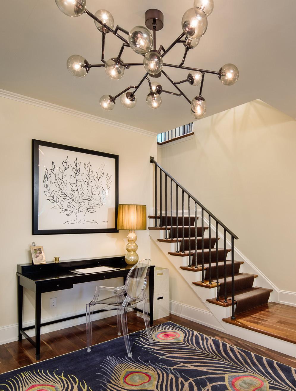 The home’s interior layout is ordered around their daily activities. The formal entry and public spaces are located on the busier street side, while personal spaces are located on the rear to maximize access to natural light and the privacy of the exterior courtyard. The kitchen, dining and living areas are arranged in an open floor plan to maximize efficiency and sense of space. The stair is located at the heart of the home and serves as both a feature object and connecting space. The large skylight and custom light fixture at the top of the stairwell ensure that light always reaches the center of the long and narrow floor plan. Mechanical equipment and ductwork are carefully centralized to minimize intrusions within each space and increase energy efficiency.