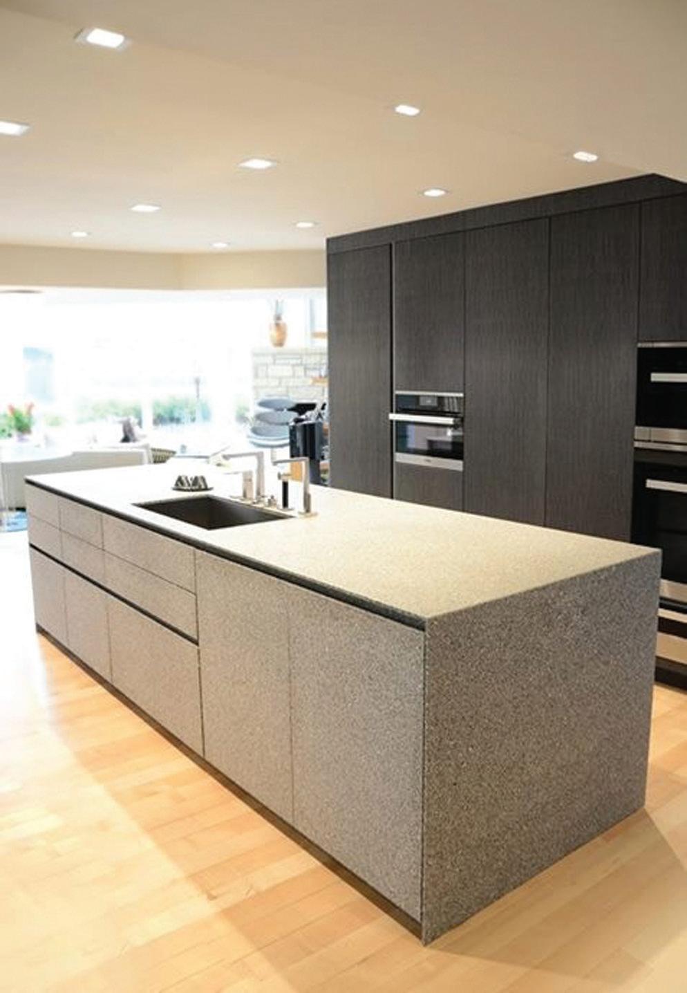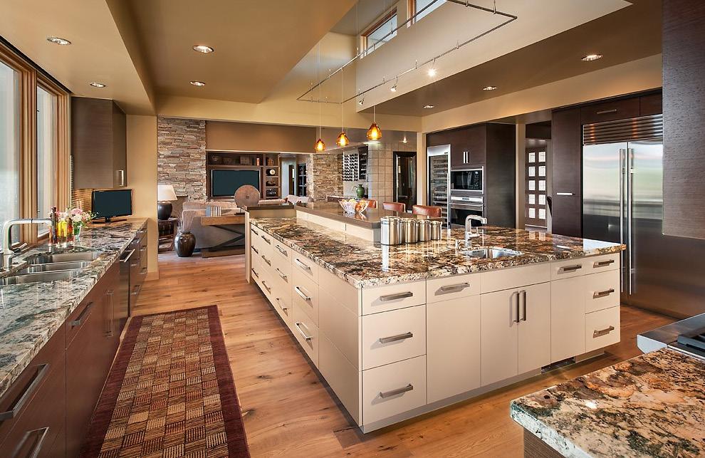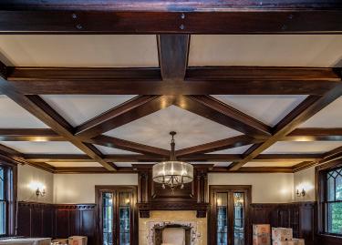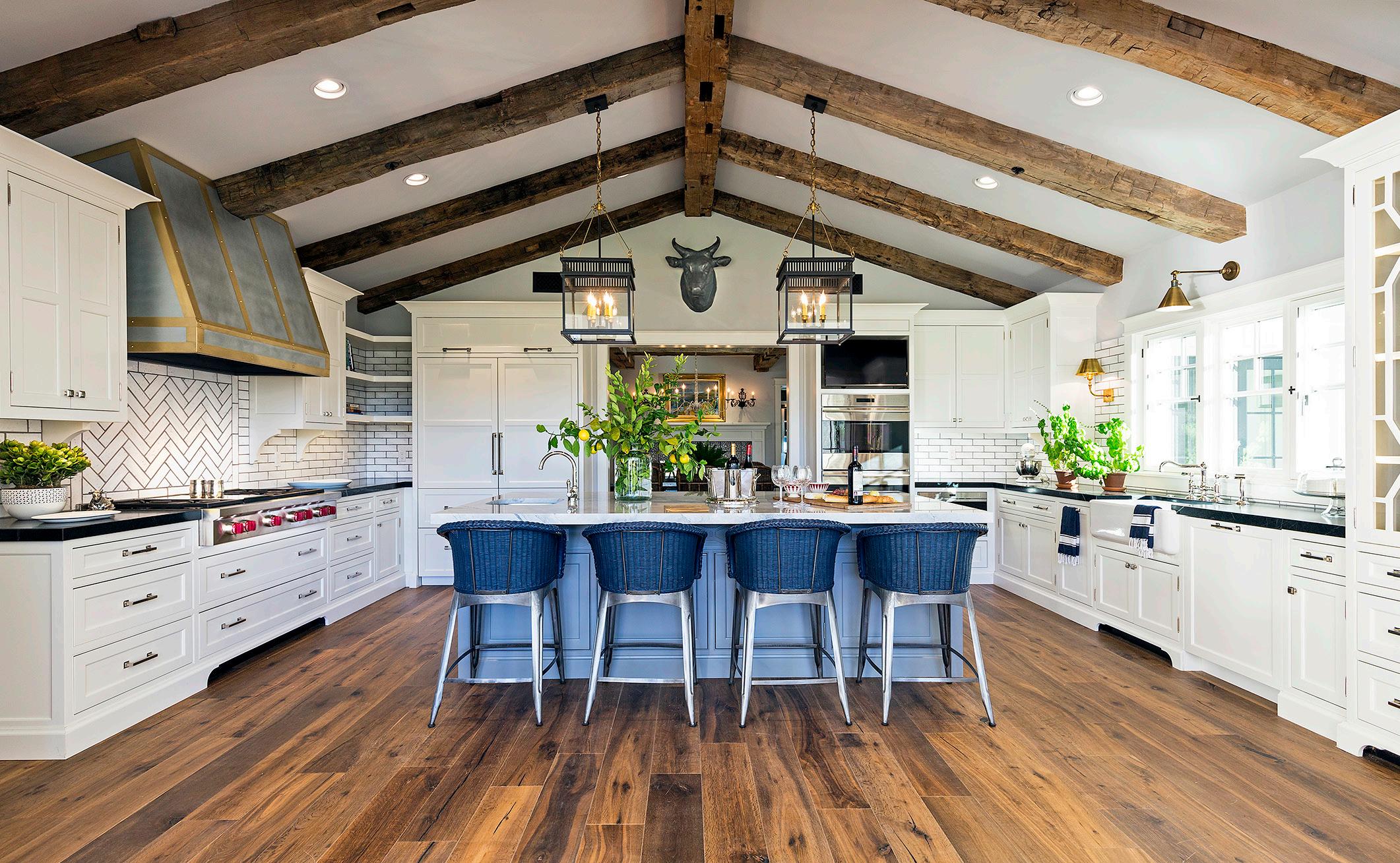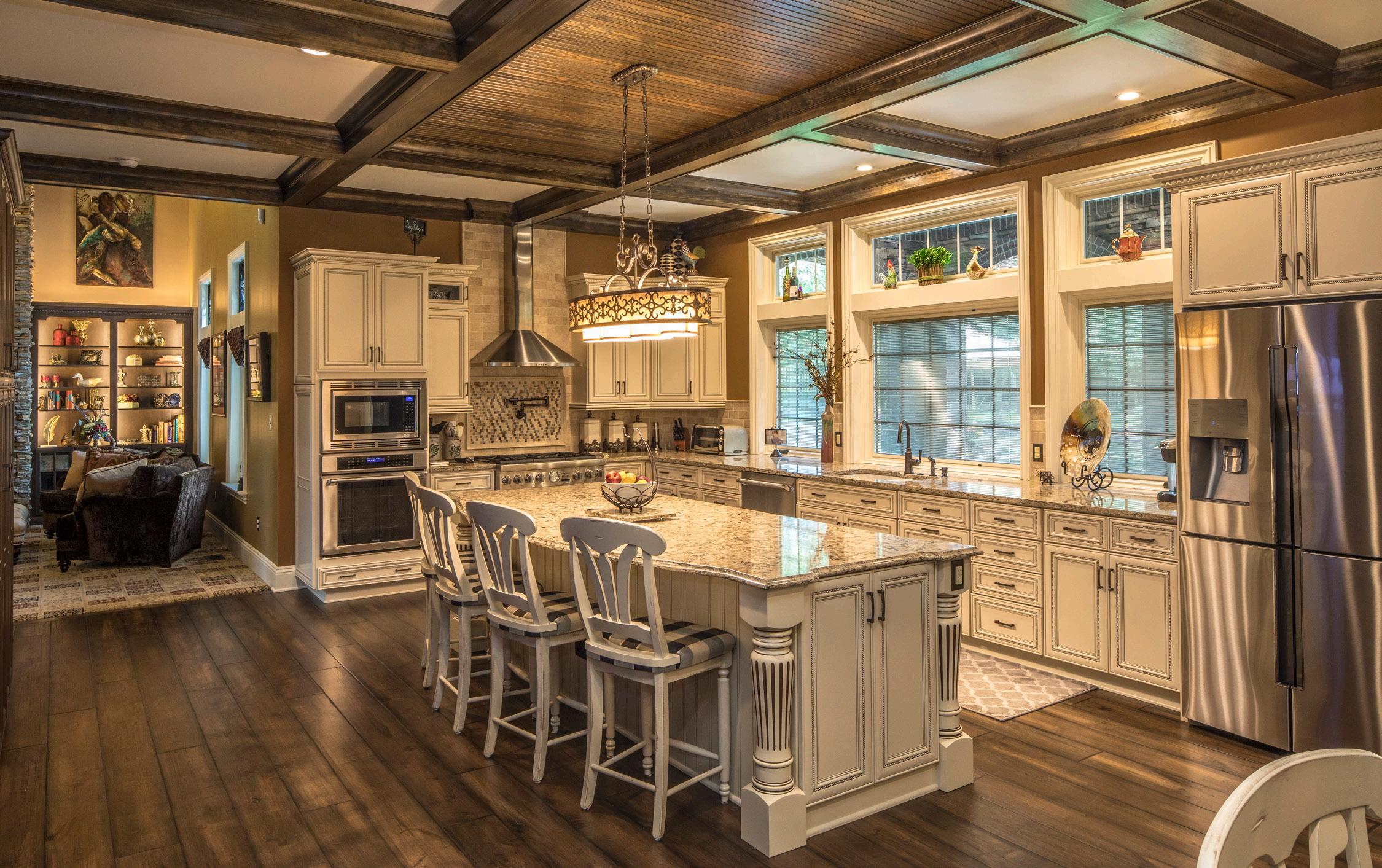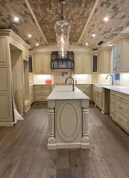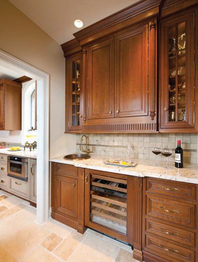 Decorative embellishments are found throughout the space, especially in the ceiling treatment with its slightly coffered look and laser carvings. It is set over the large island work area, which has an upper seating area to accommodate family or guests.