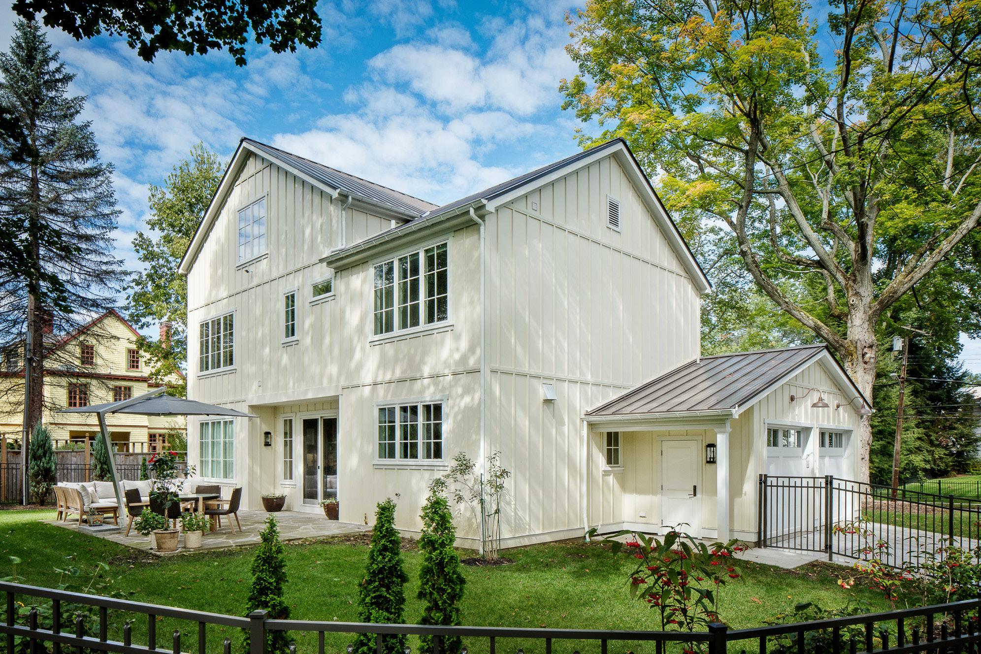 The exterior of this home was designed as a craftsman style farm house to fit into the neighborhood context, while the interior was done in a contemporary shaker style. The new house was woven around mature trees that were present on the fifty-year-old site, giving the house a feeling of having existed for decades. The first floor includes a master suite with a sitting room, 3 children’s rooms, living room, dining room, family room and a large kitchen with a butler’s pantry that connects to a child’s study room. An office off the hallway can be hidden behind motorized bookcases that pocket into the walls. The second floor features another office that doubles as a guest room with a bed that pulls out of the wall. The basement includes a theater room, full bath and ample storage. All three floors are connected by a stair and an elevator. Other unique features include a dog-washing station and a fencedin cat patio for this family of pet lovers. The porte-cochere conceals an auto court for the 6-car garage and a side entry.