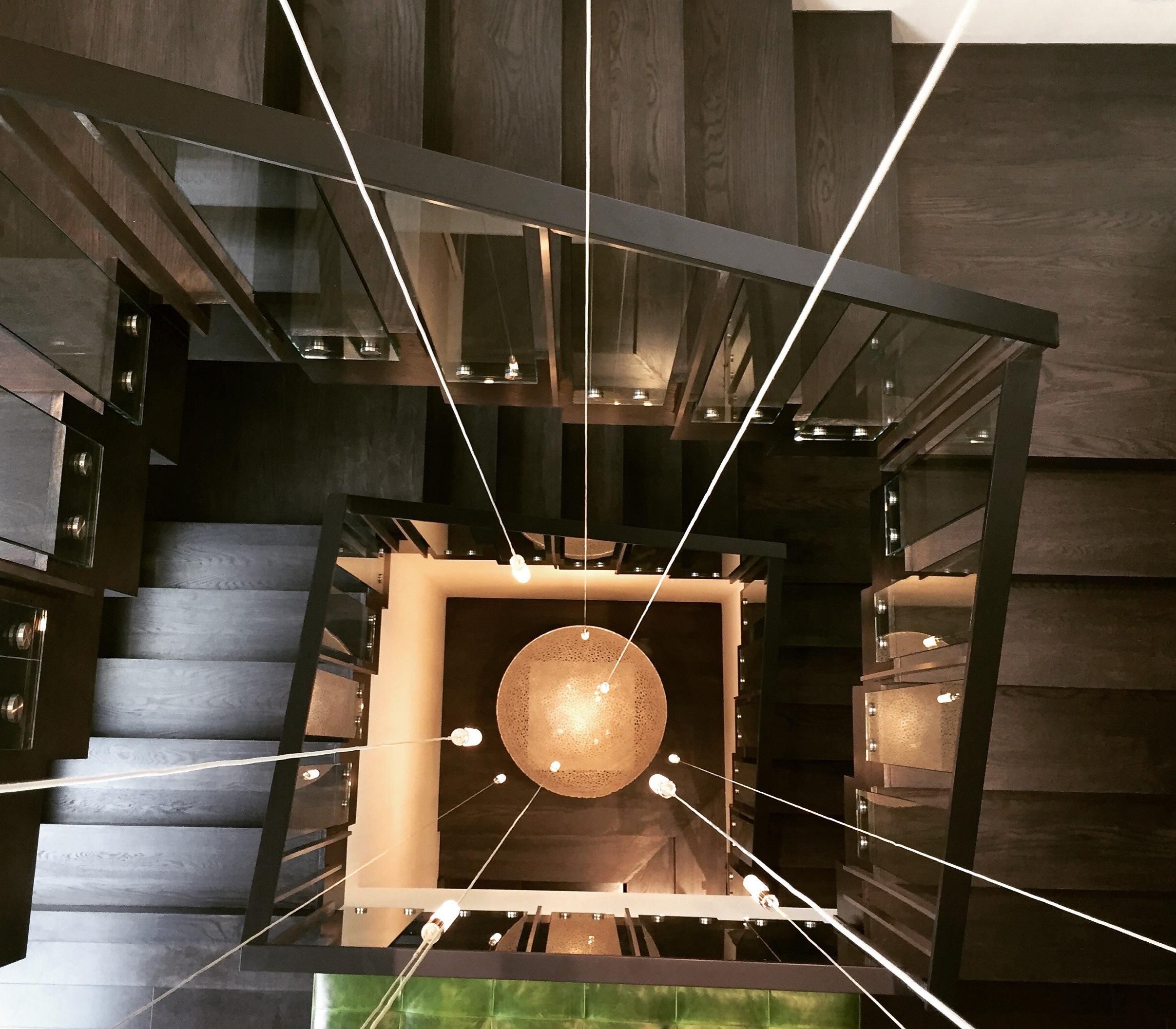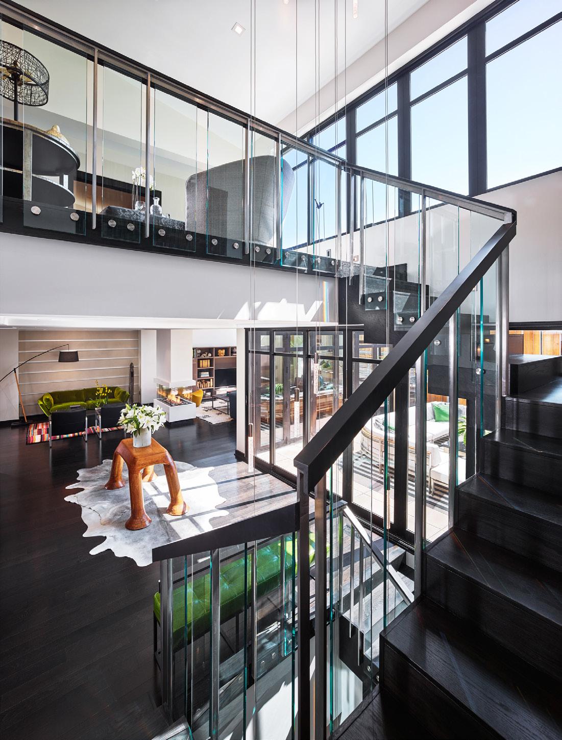 Entering the lower level from the motor court at the core of the building, one immediatly feels welcomed by the intimate scale spaces dressed in warm tones. The large floating staircase connects all three levels of the home within a soaring volume that accentuates the open nature of the design. Custom glass and stainless-steel railings were selected to provide a clean and modern feel.