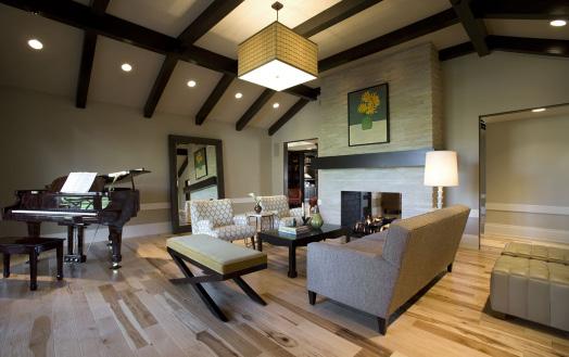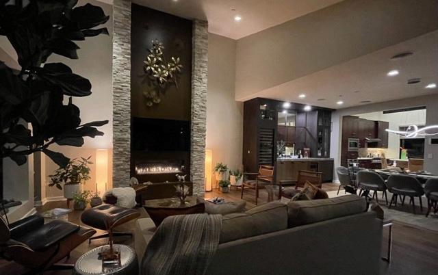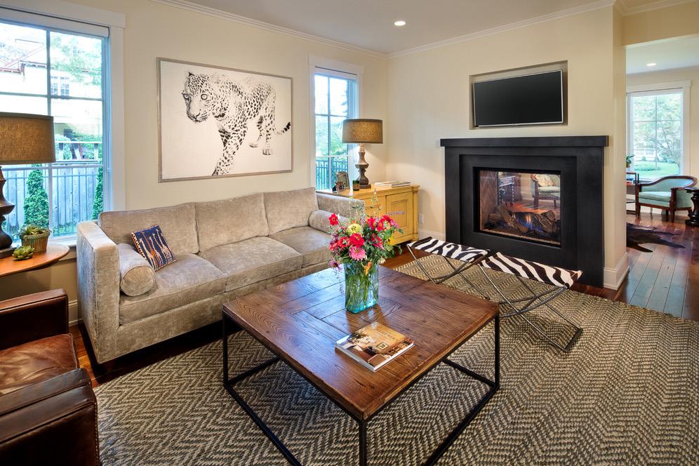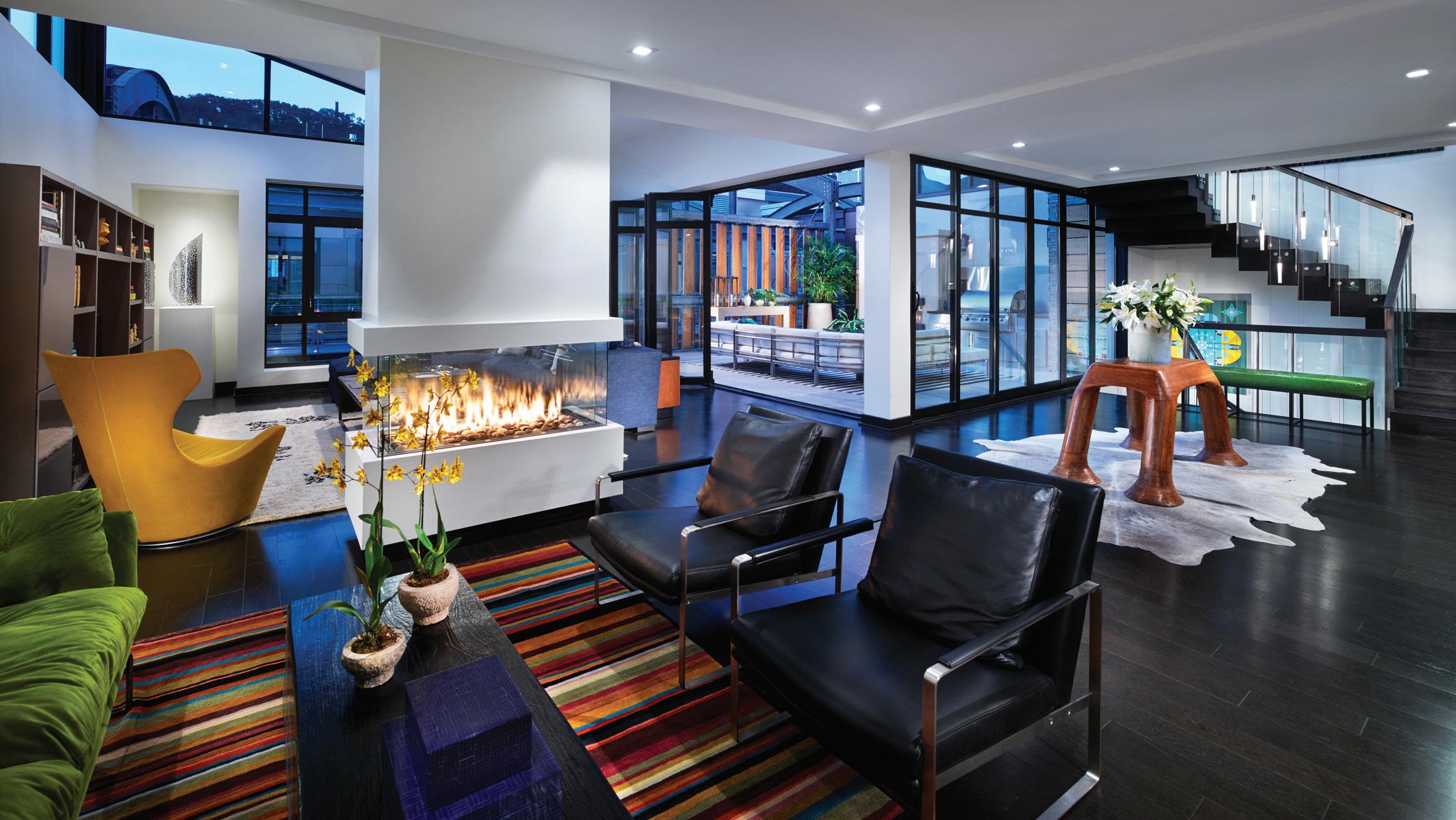 One feature that stands out in the main living area is a custom floating fireplace. This fireplace sits between the living room and the formal reading room, separating the spaces for privacy, but links the two spaces together.