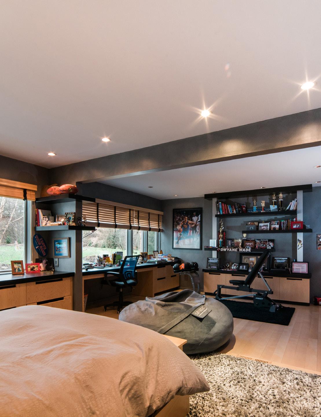 The owner’s goal was to provide a bedroom for their teenage son that would reflect his personality and interest in sports. The program included a sleeping area, study area with built-in desk along the window, and a lounge area. The room has a masculine feel that is elegant, yet fun and youthful. The space features some amenities to make the room more comfortable, such as ample storage space in the closet as well as custom designed built in shelving system. The natural wood, grey concrete walls and black lineal accents and custom built-in furniture create a cool and dynamic space while the floor plan allows for flexibility so their son will be able to grow and adapt the room as time progresses.
