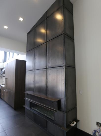 The black trim also creates an industrial contemporary style that carries on to other locations in the home. For example, the custom primary shower doors are framed in black powder coat aluminum, creating a unique feature. The home also features a custom steel-clad fireplace in the living room, which gives the space personality.