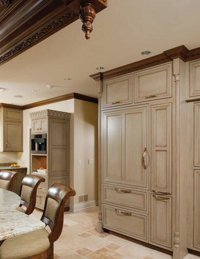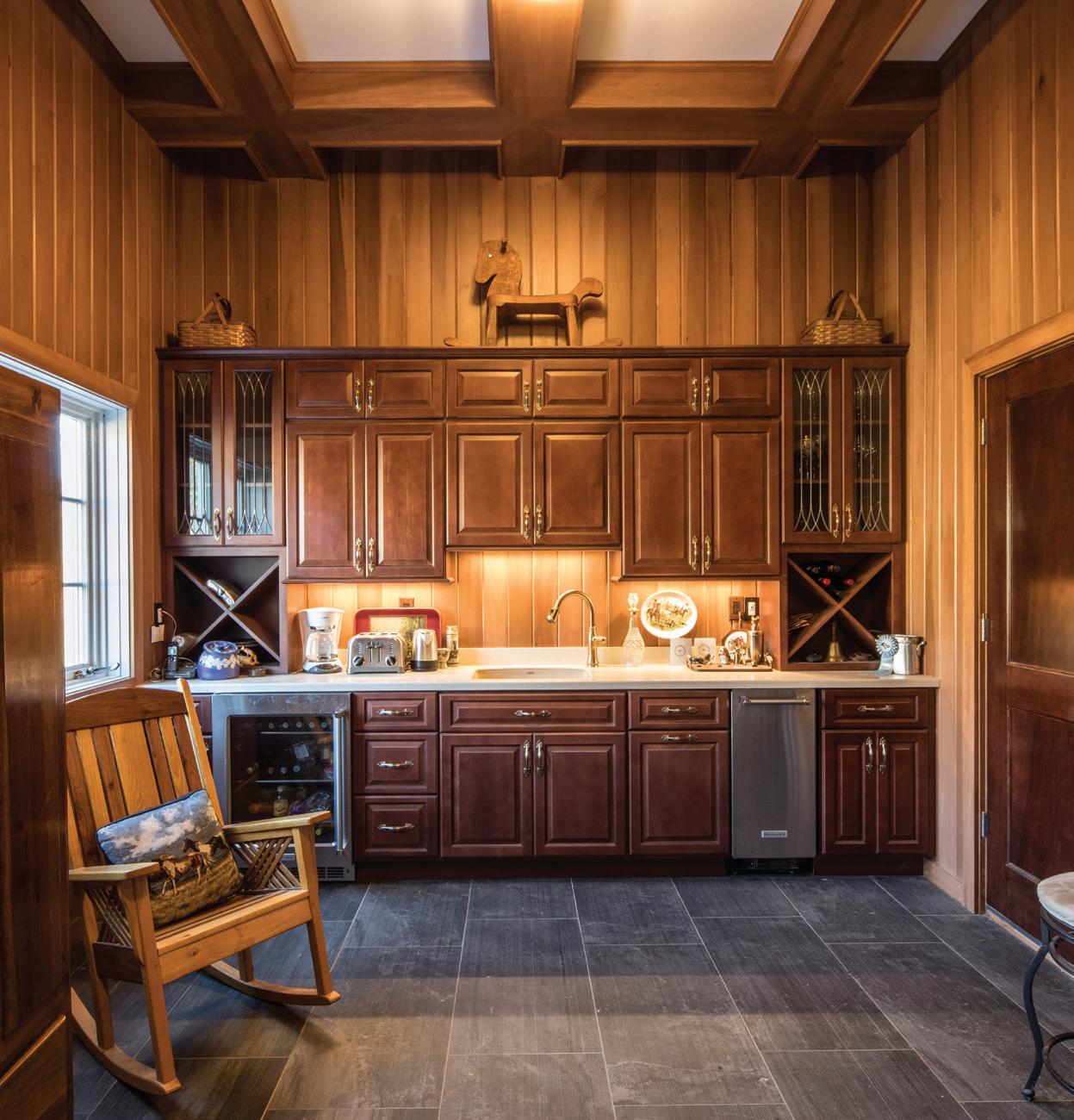 The custom cabinetry has two finishes, driftwood and mocha, and extends all the way to the ceiling, packing 1,400 cubic feet of storage into this room. The semi-transparent stain on the cabinetry allows you to see the fine figuring in the cherry wood. High-end paneled appliances give this room a very elegant feel that was important to the owners.