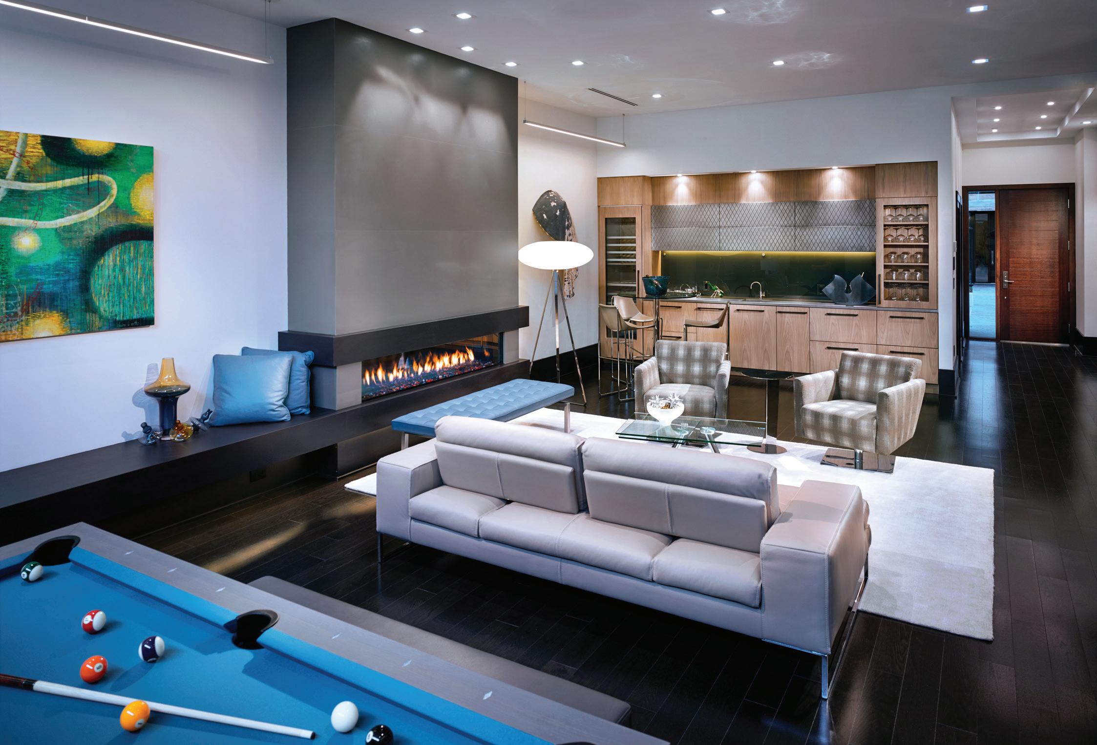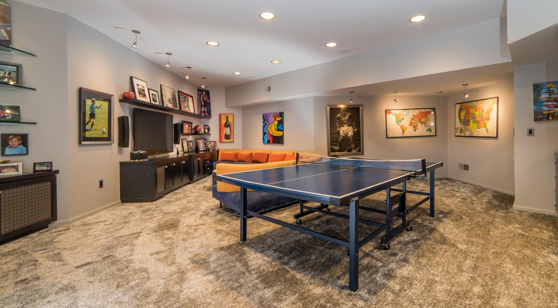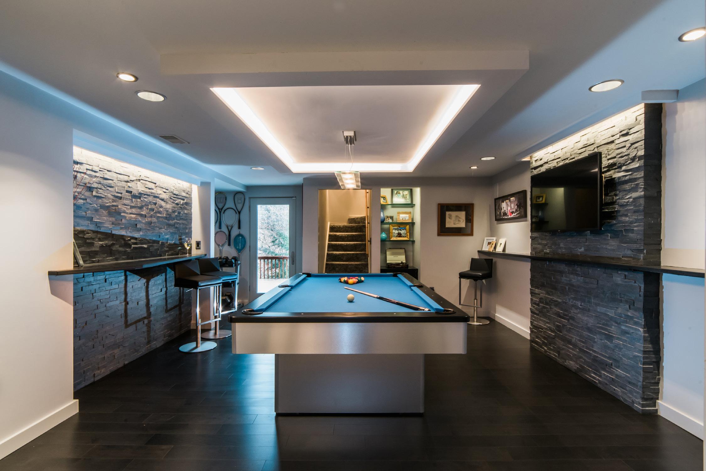 This cool newly remodeled home is the perfect space for entertaining guests of all ages. The space has a sleek and modern design that responds to the owners personality. Although the space has one general function, the whole space is divided into two distinct areas. One area, which contains a ping pong table and an entertainment system, is a warmer and cozier space, finished with high pile carpeting and comfortable furniture for lounging. The second area, which contains the billiards table, has a cooler vibe, finished with a dark stain hard wood flooring, and uses real stone cladding for accent walls. This area also uses mood lighting, creating a light box over the pool table, and uses accent lighting to highlight the stone walls.