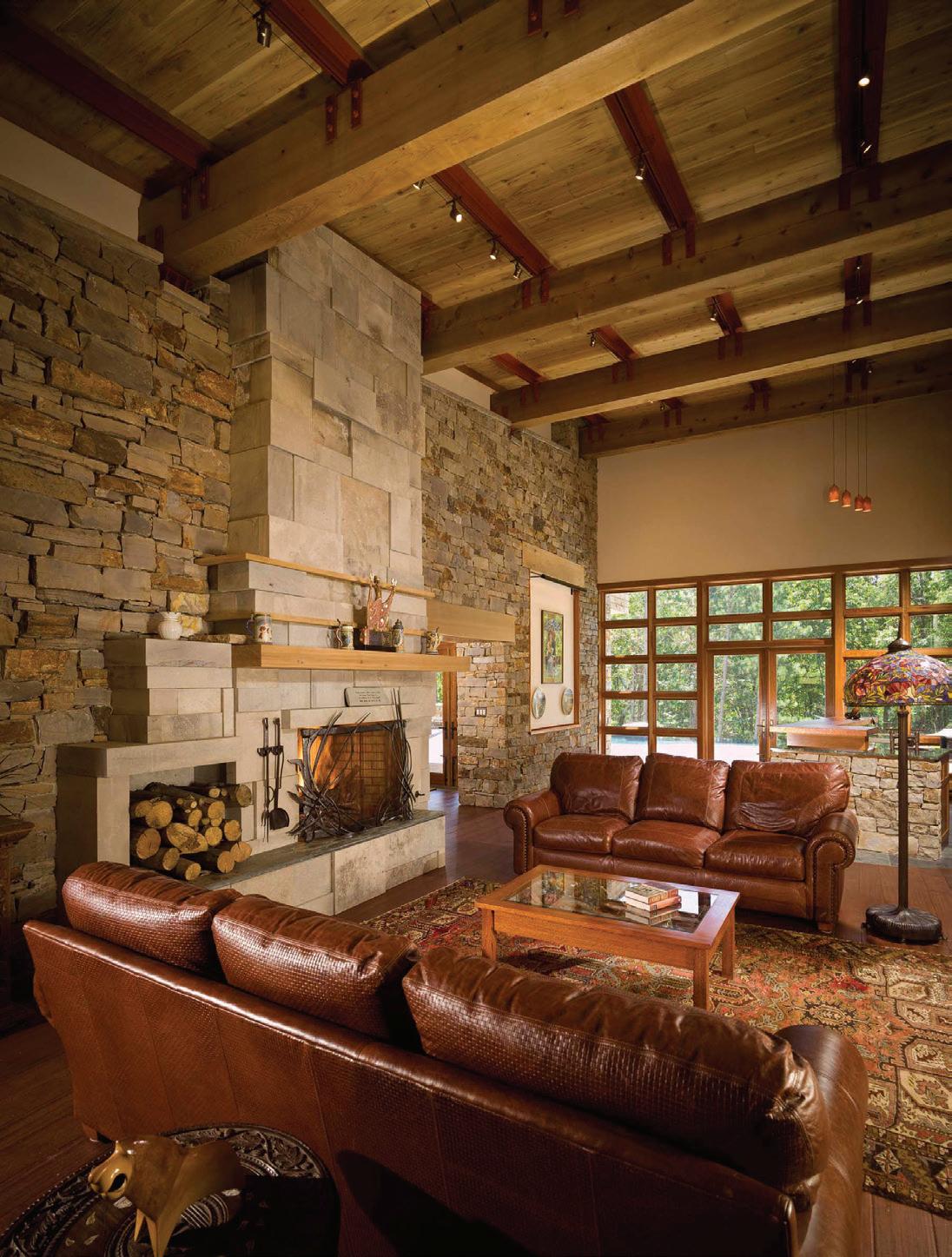 Due to the stunning site for this home, the plan organically follows the contours of the hillside to take advantage of southeast/west views. Local ledge rock, which has been collected and stacked to create massive walls, provides definitive spatial separations in a strong design statement. This is echoed in the massive finished stone fireplaces, Western Red Cedar beams, and roof deck.