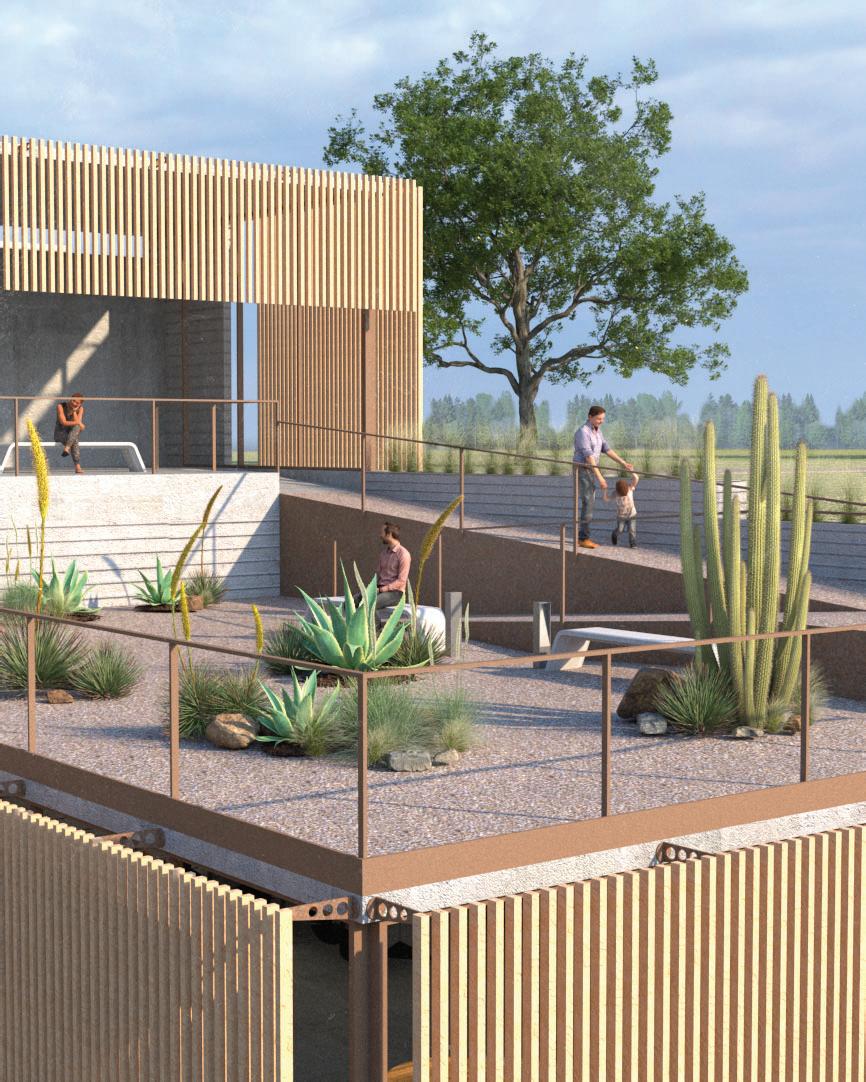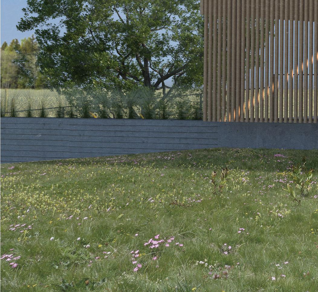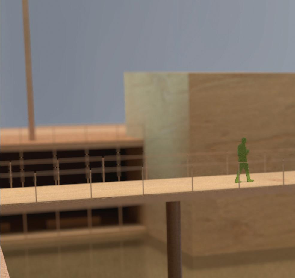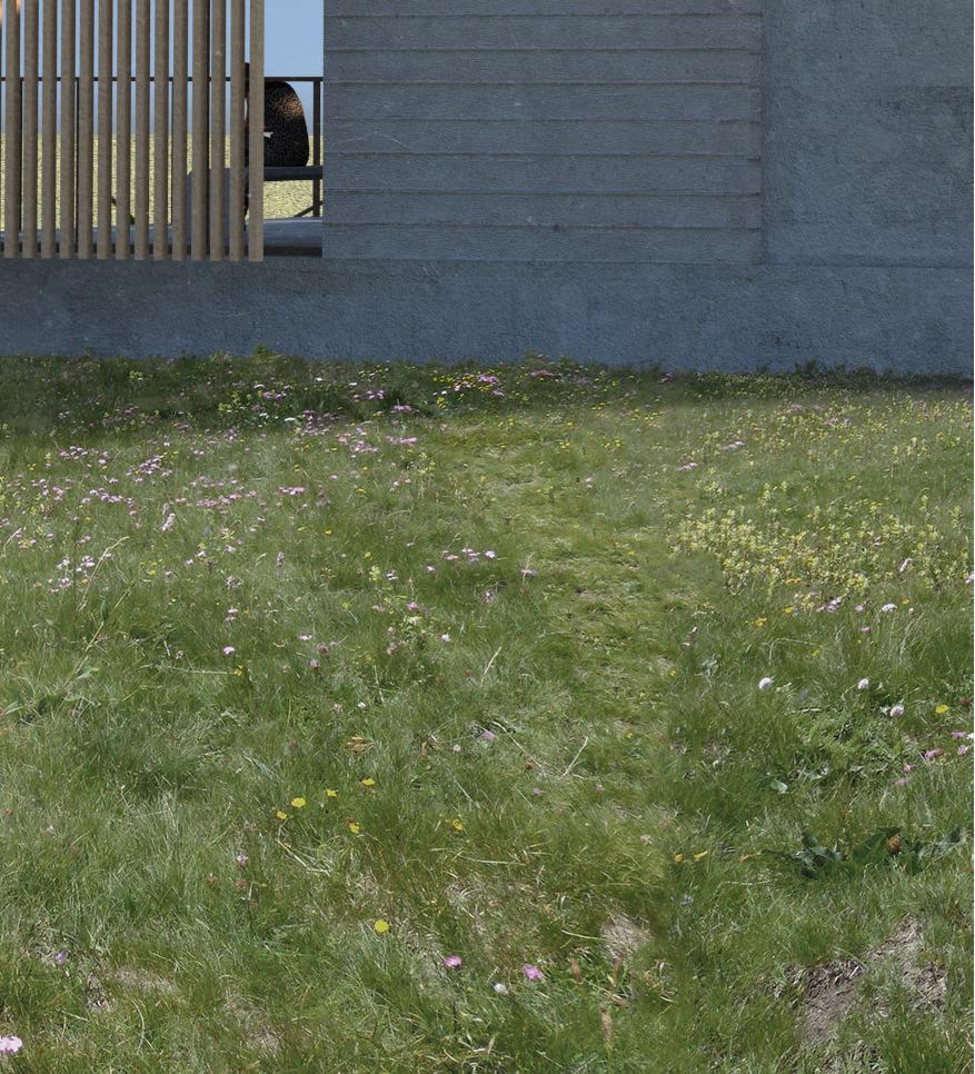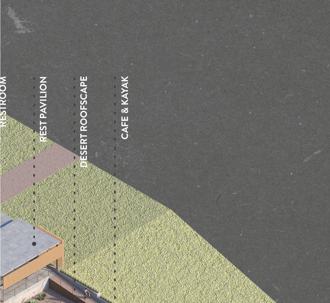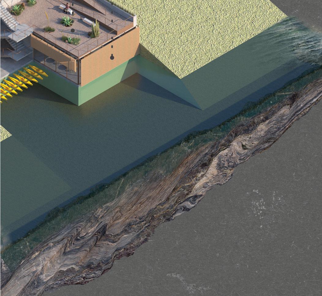 Via ramps, visitors are drawn through one space and into anoth- Via ramps, visitors are drawn one space and into another. Creating an uninterrupted flow towards function, however er. an flow towards however indirect, in order to produce unique experiences. Providing visitors a moment to contemplate nature, and the adventure ahead of them. Two monolithic walls make up the entrance, guiding guests in, while immersing them into the serene, designed landscape.