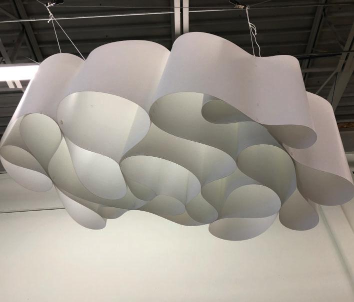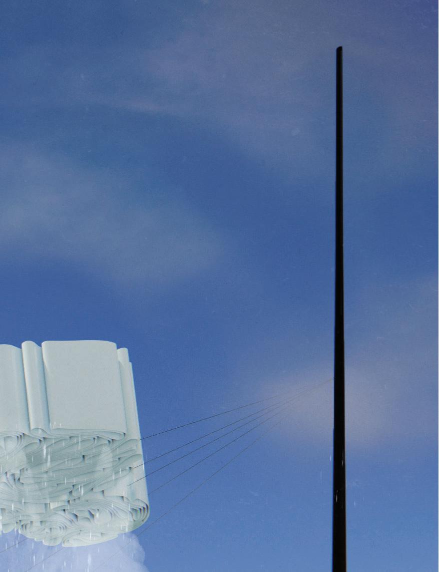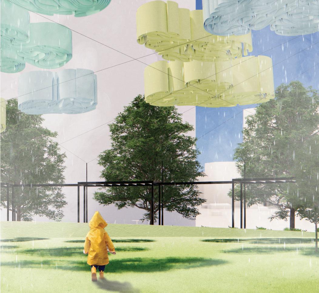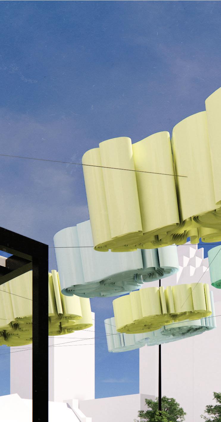 A single ribbon of thin polycarbonate sheeting flexes and bends onto A ribbon of thin flexes onto itself to form our cloud configurations. Determined by a grasshopper to our Determined a script, the ribbon follows contour lines that shape it into its thallus formation. Each point of contact of the contour lines serves as a welding point, that keeps the structure from unwinding. The clouds are hung from a wire system that enables the translation of their position. Their construction allows them to be store neatly above the pergolas.