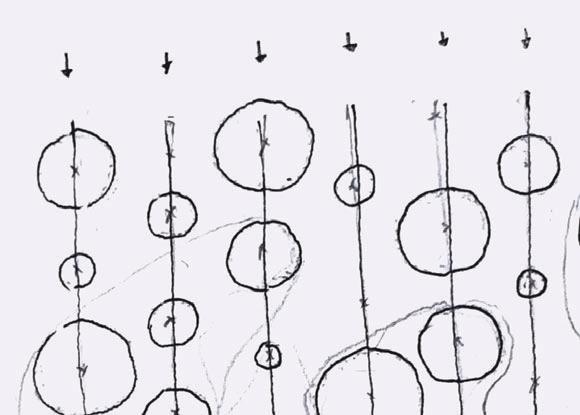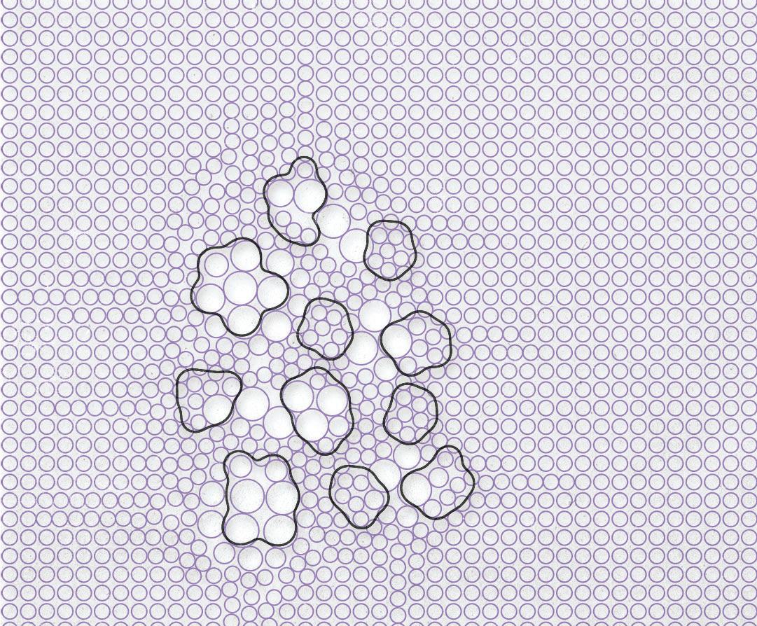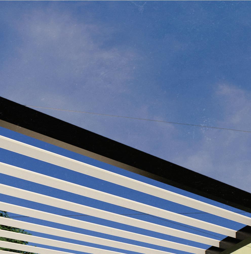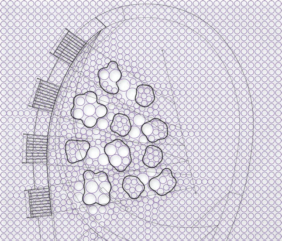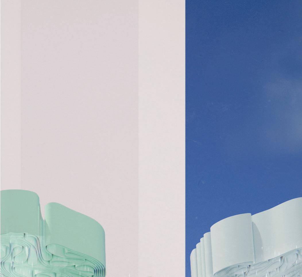 A single ribbon of thin polycarbonate sheeting flexes and bends onto A ribbon of thin flexes onto itself to form our cloud configurations. Determined by a grasshopper to our Determined a script, the ribbon follows contour lines that shape it into its thallus formation. Each point of contact of the contour lines serves as a welding point, that keeps the structure from unwinding. The clouds are hung from a wire system that enables the translation of their position. Their construction allows them to be store neatly above the pergolas.