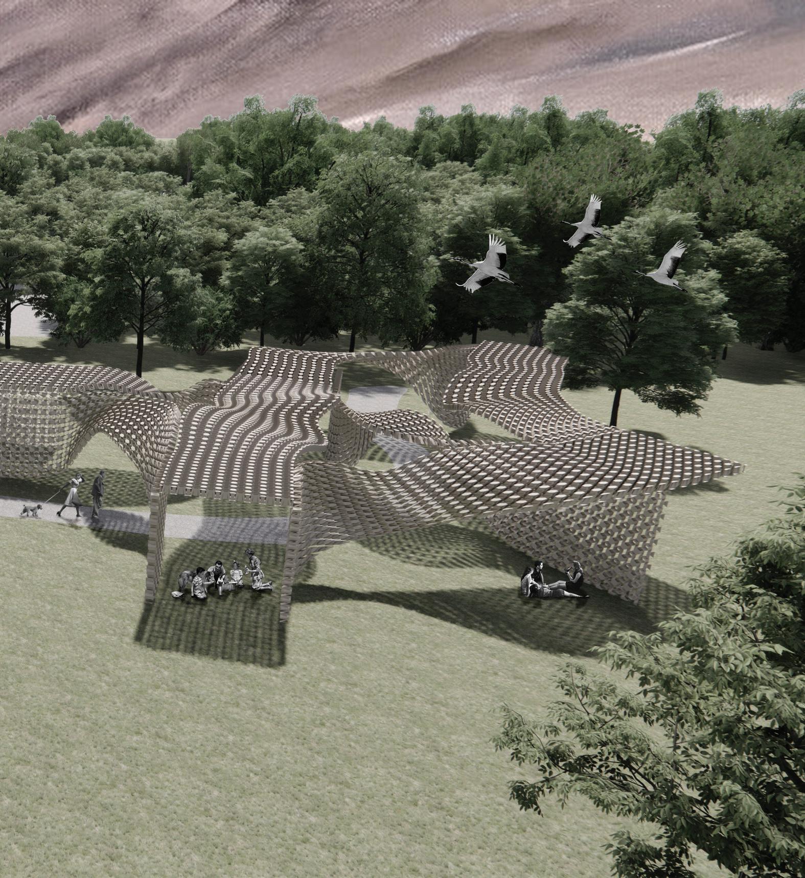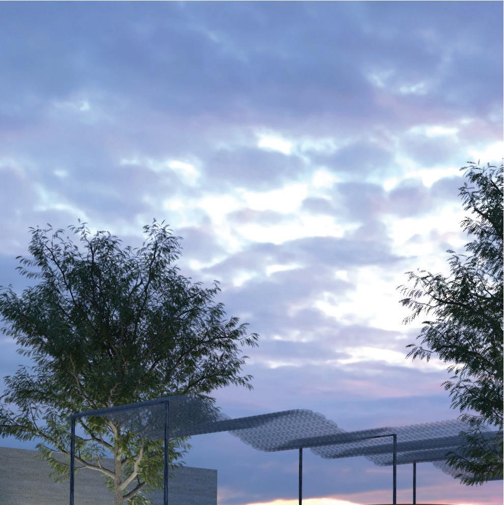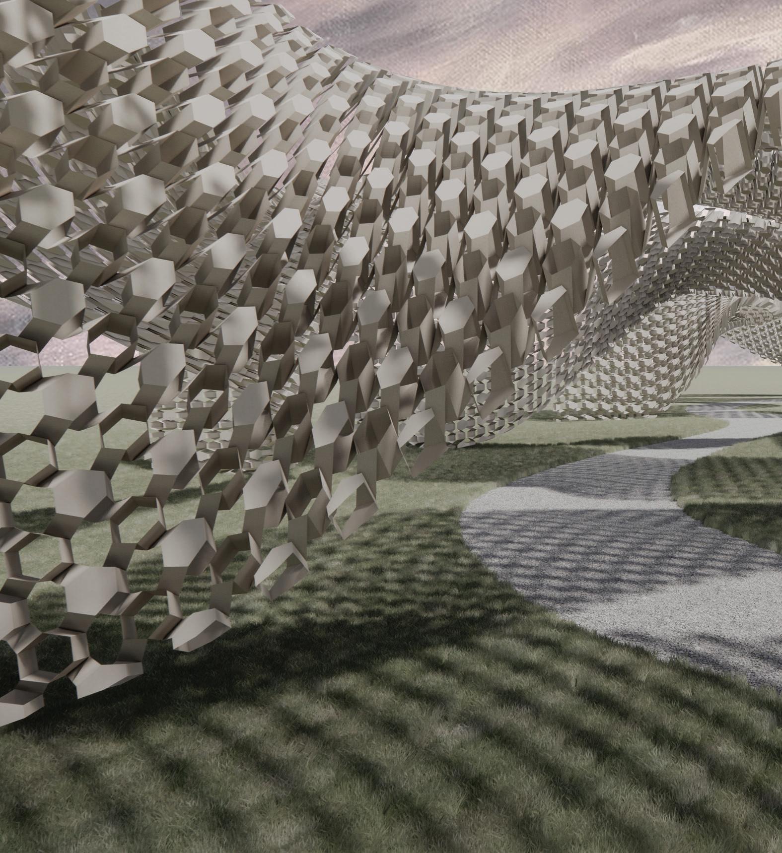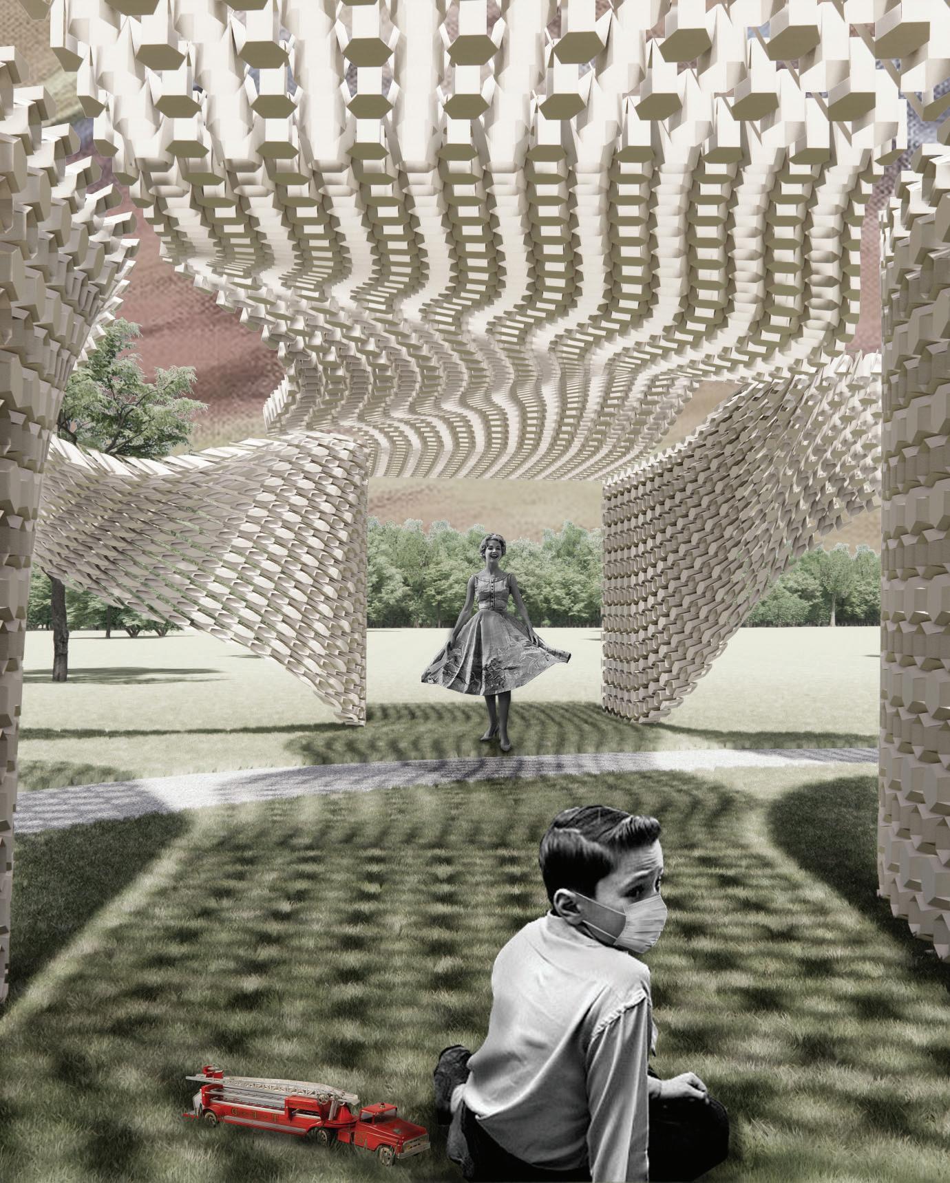 The Pandemic brought with it innumerable losses, one of which is the loss of connection, our connections to loved ones, friends, coworkers, and so on. The goal of this pavilion is to reflect in its design the almost ordinary settings we reside in, as well as the altogether strange and unconventional connections we have to the people around us. This parametrically designed pavilion, made up of powder coated aluminum panels, stretches across the site in the form of strange, undulated, ribbons that culminate into several rectilinear nodes.
