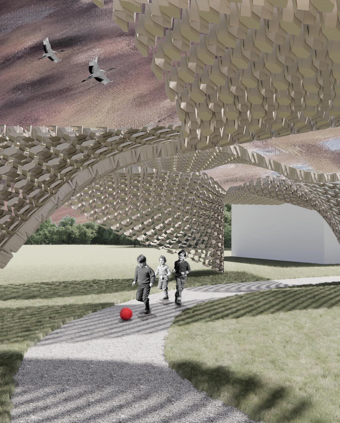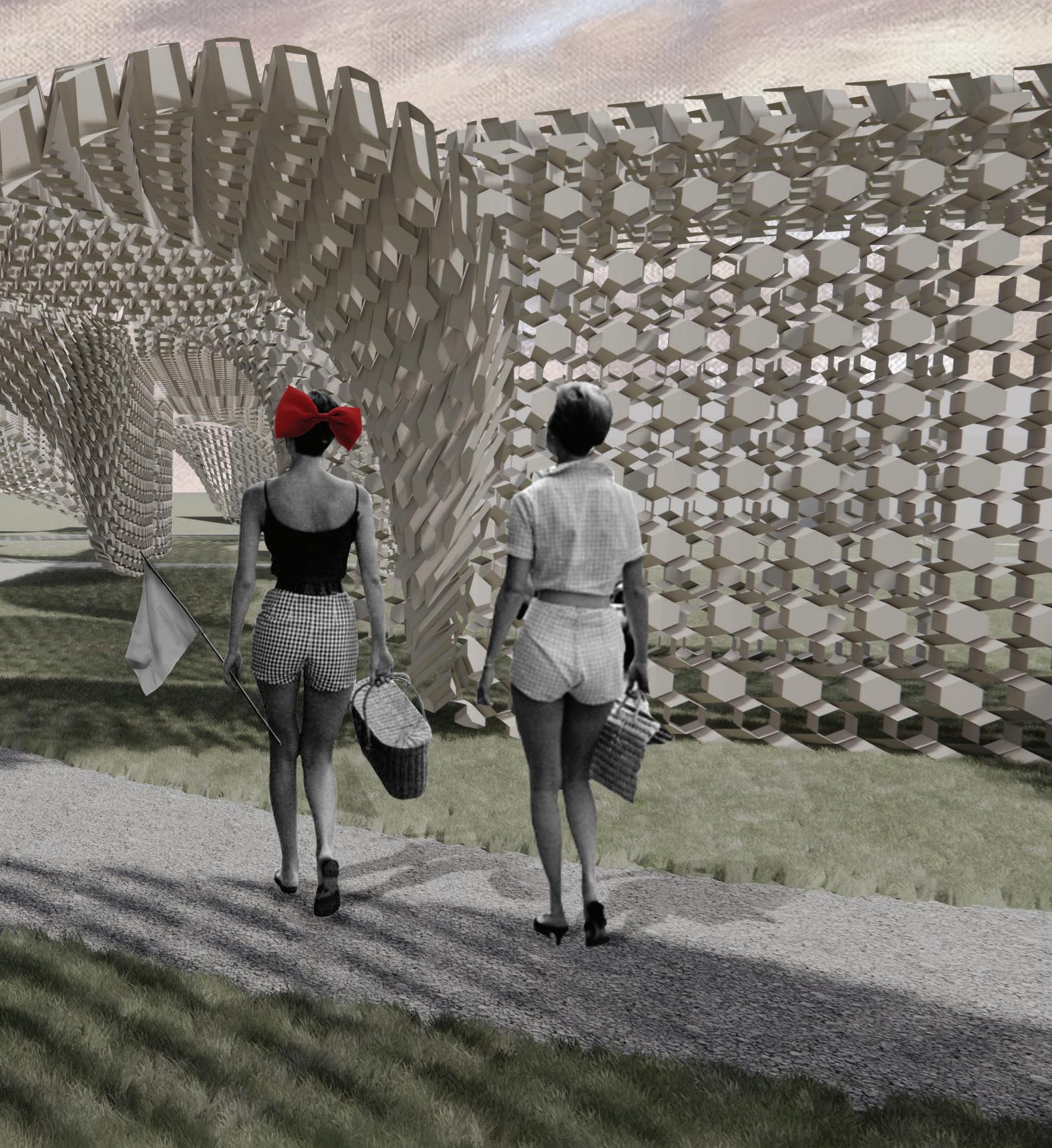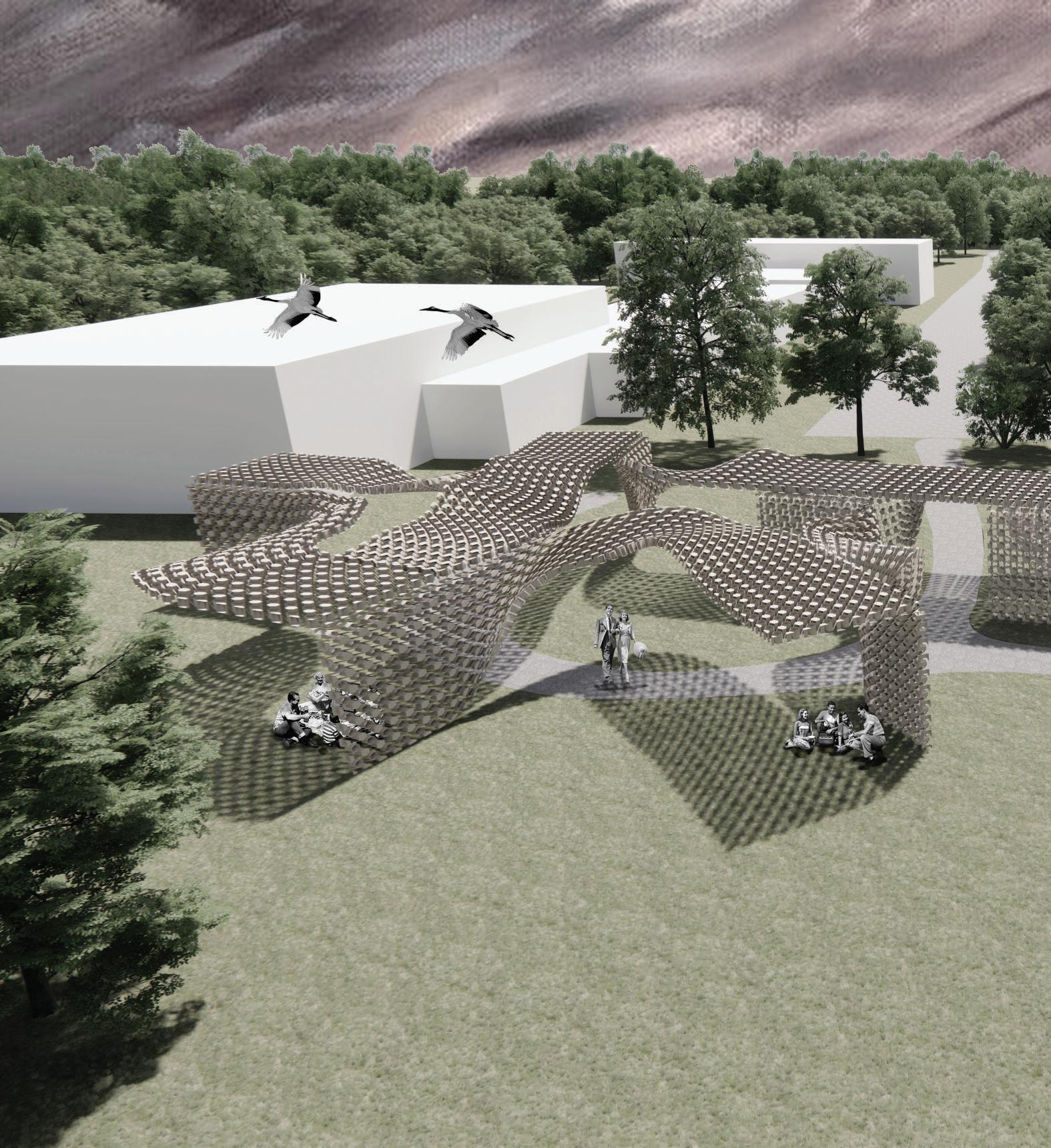 The Pandemic brought with it innumerable losses, one of which is the loss of connection, our connections to loved ones, friends, coworkers, and so on. The goal of this pavilion is to reflect in its design the almost ordinary settings we reside in, as well as the altogether strange and unconventional connections we have to the people around us. This parametrically designed pavilion, made up of powder coated aluminum panels, stretches across the site in the form of strange, undulated, ribbons that culminate into several rectilinear nodes.