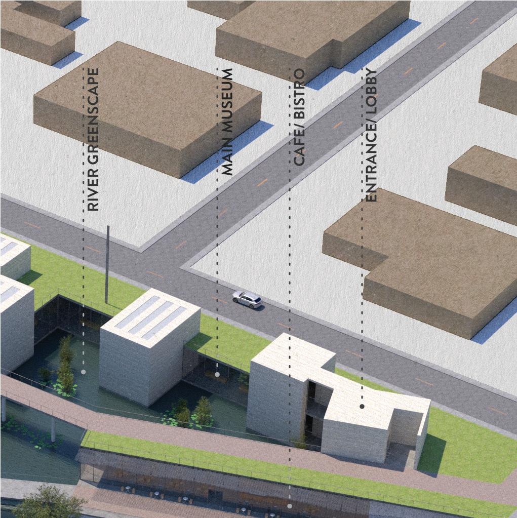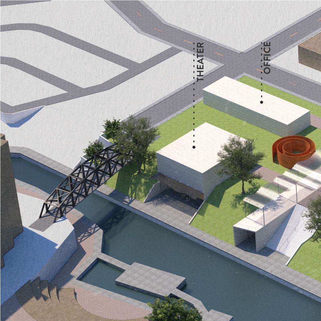 A contemporary art museum, Piedras is located on the San Antonio River across from the historic Pearl in Downtown San Antonio, TX. Travertine boxes housing galleries jut out of the subterranean museum into a serene, green water-scape. As the name Piedras (spanish for rocks) suggests, the inspiration for this project came from the sedimintary rock formations that line many of the rivers in the area. Extending from the banks, these formations create a more sudden, and less gradual descent towards the river.
