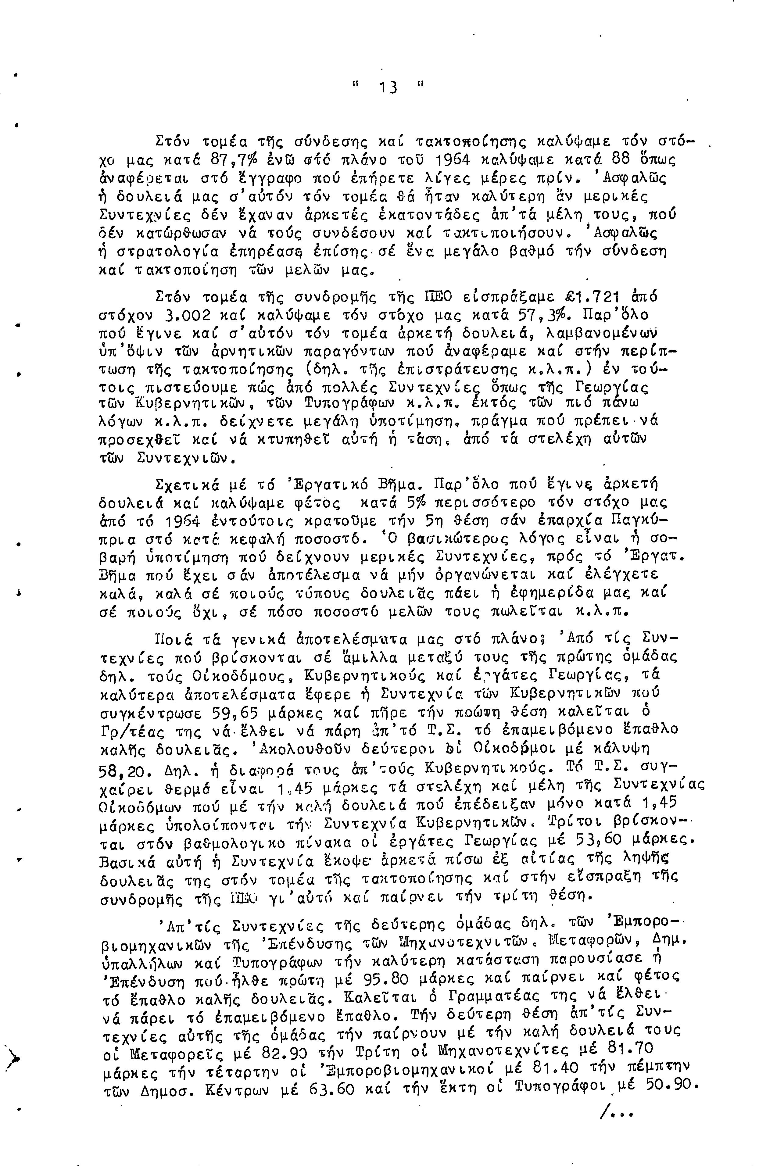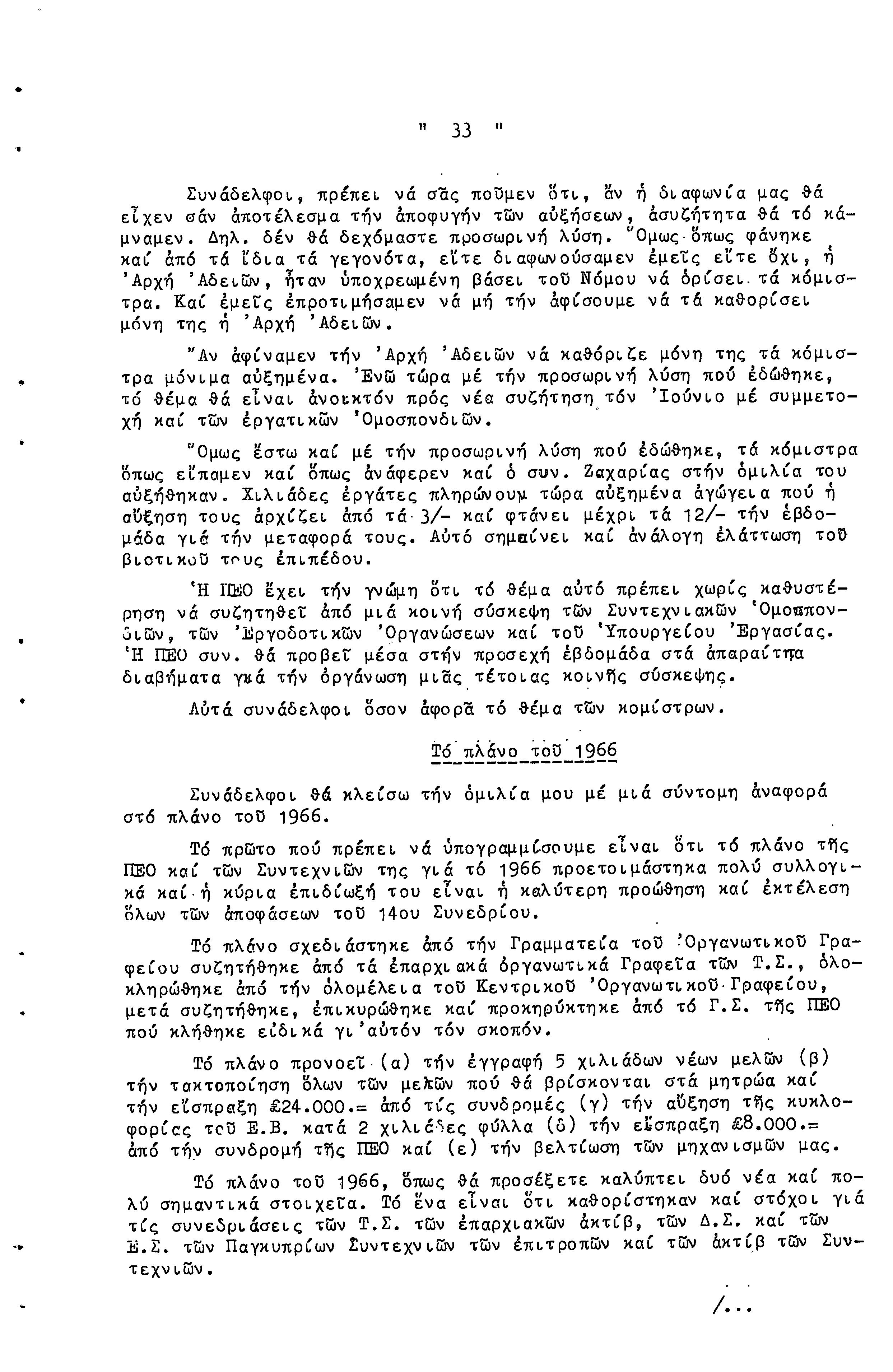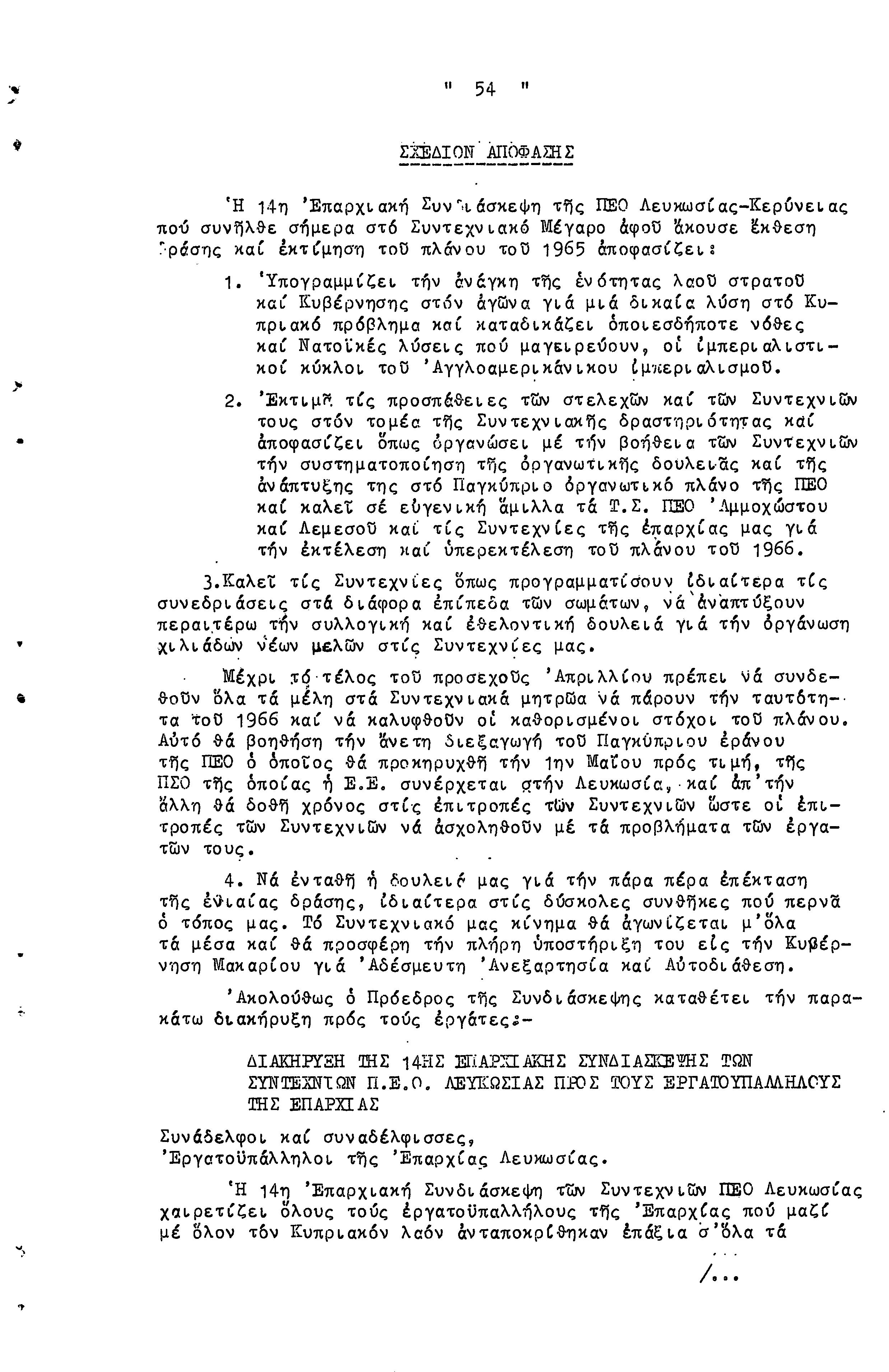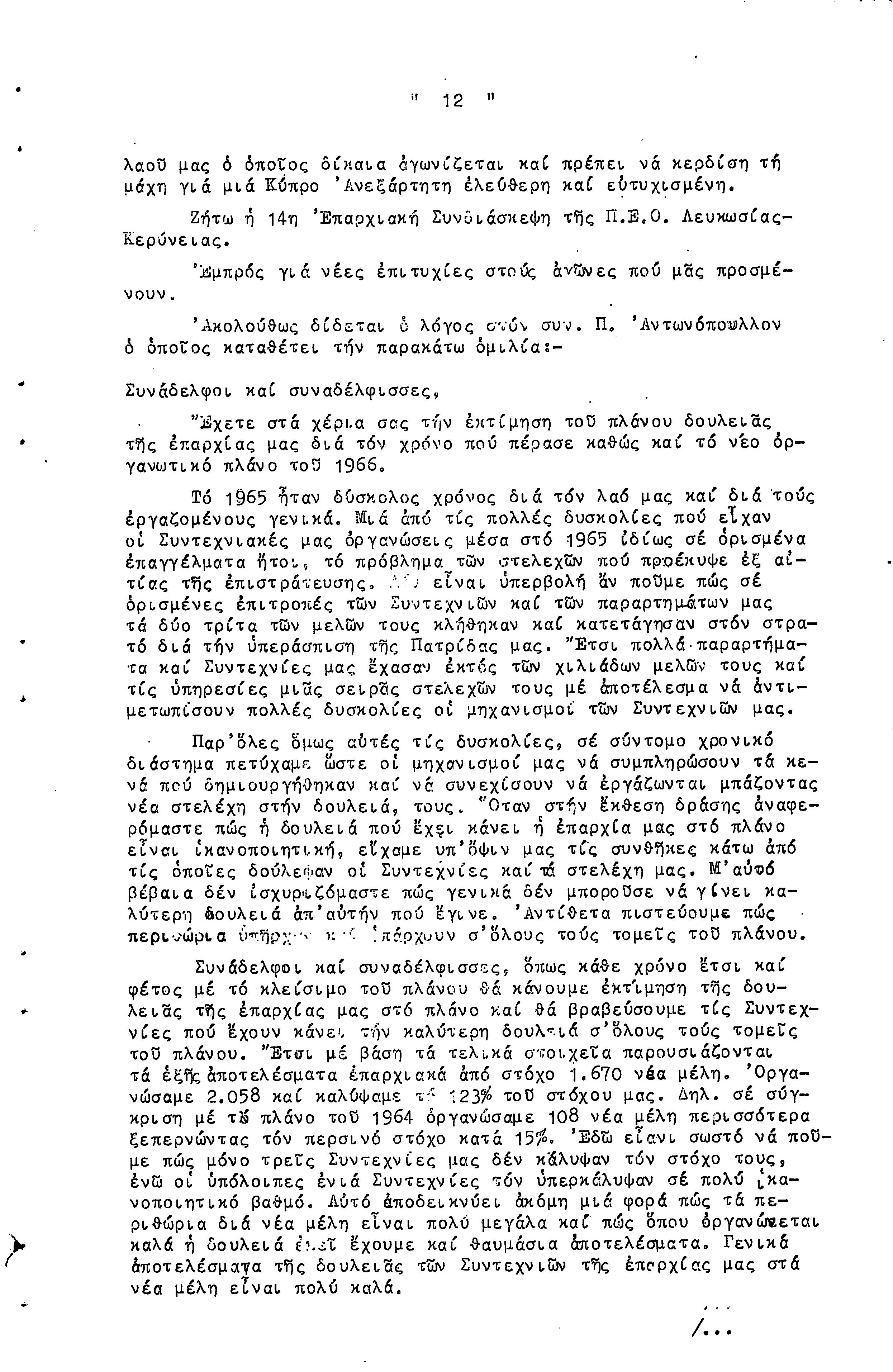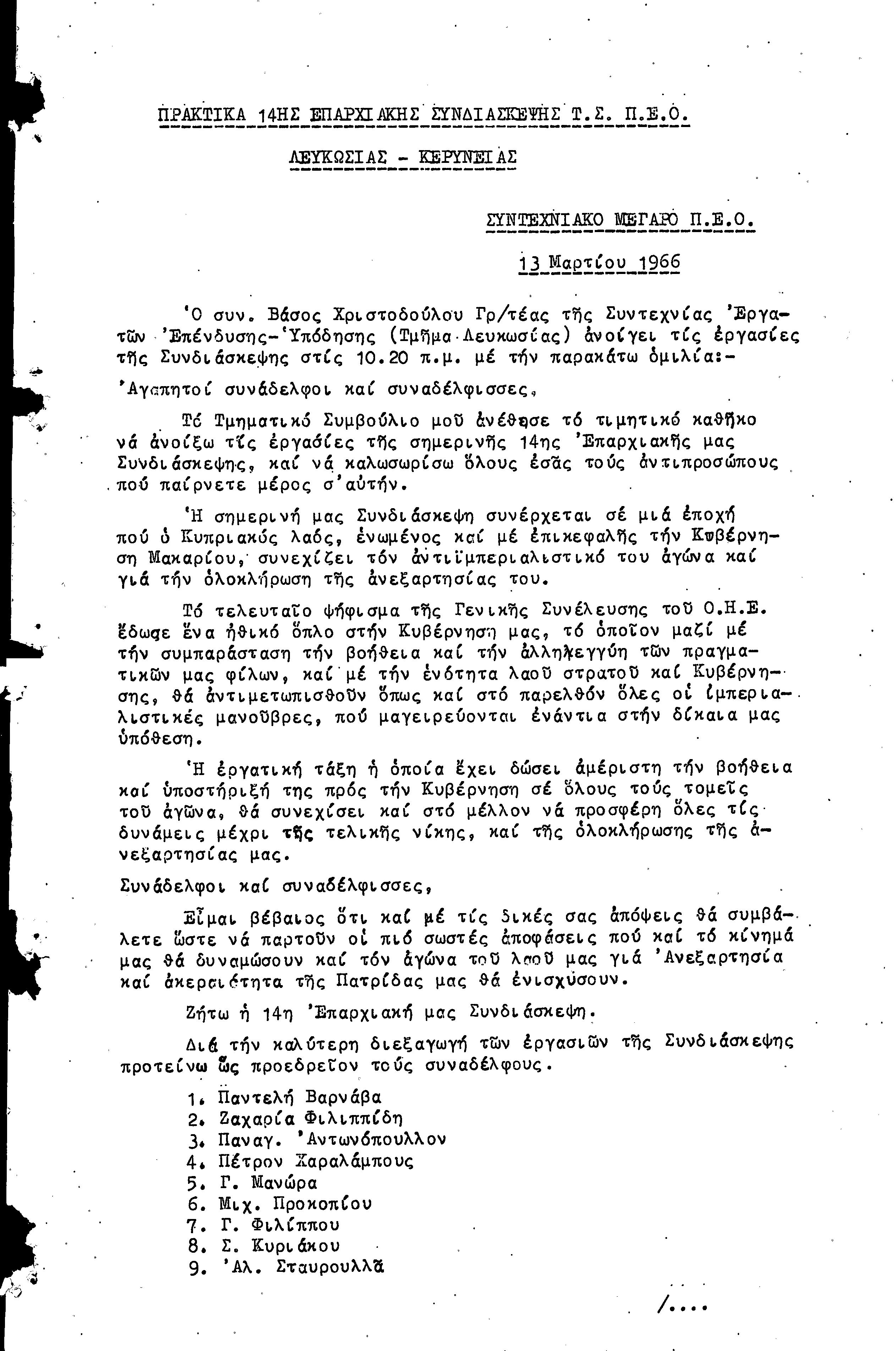 14η ΕΠΑΡΧΙΑΚΗ ΣΥΝΔΙΑΣΚΕΨΗ Τ.Σ. ΠΕΟ ΛΕΥΚΩΣΙΑΣ-ΚΕΡΥΝΕΙΑΣ, 13.03.1966 ( ΠΡΑΚΤΙΚΑ)