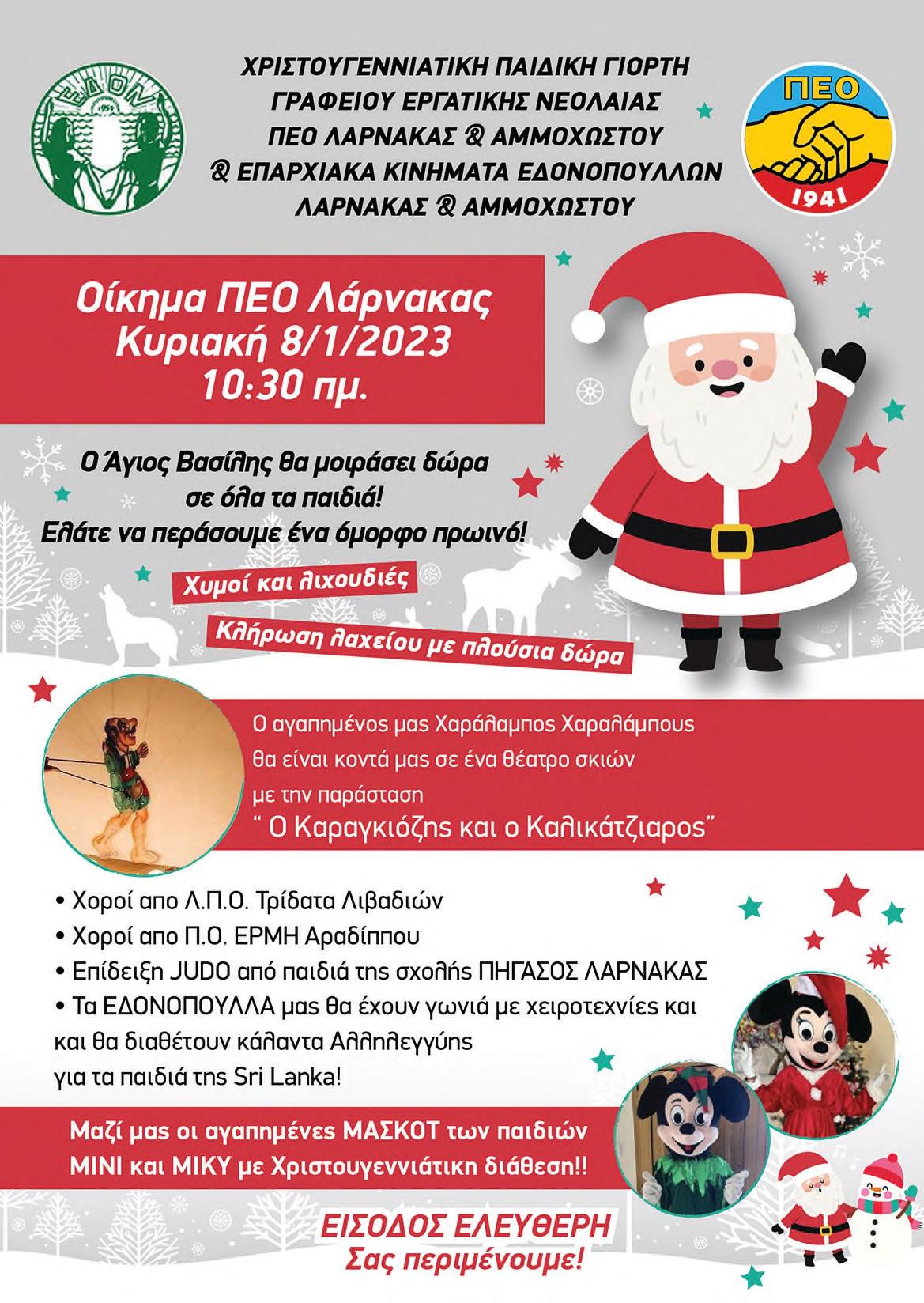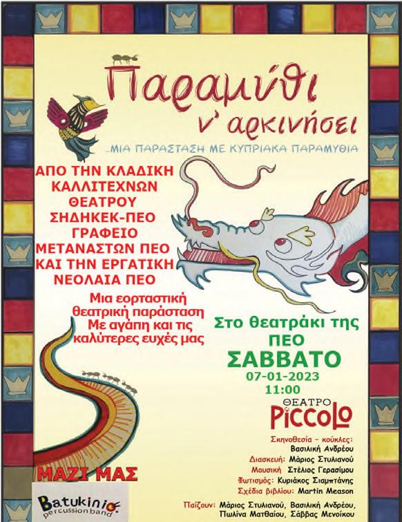 Καλλιτεχνών Θεάτρου της ΣΗΔΗΚΕΚ-ΠΕΟ μαζί με το Γραφείο Μεταναστών της ΠΕΟ και το Γραφείο Εργατικής Νεολαίας της ΠΕΟ, θα πραγματοποιηθεί το Σάββατο, 7 Ιανουαρίου, στις 11 το πρωί, στο Αμφιθέατρο της ΠΕΟ στη Λευκωσία. Η εκδήλωση είναι αφιερωμένη στα παιδιά των μελών της Ομοσπονδίας, στα παιδιά των άνεργων, στα παιδιά των πολυπολιτισμικών δημοτικών σχολείων που οι οικογένειές τους δοκιμάζονται κάτω από αντίξοες συνθήκες λόγω της συνεχιζόμενης κρίσης, ανεργίας και στα παιδιά των οικονομικών μεταναστών και προσφύγων που ζουν στην Κύπρο. Πολυπολιτισμική εορταστική εκδήλωση με τα παιδιά όλου του κόσμου!