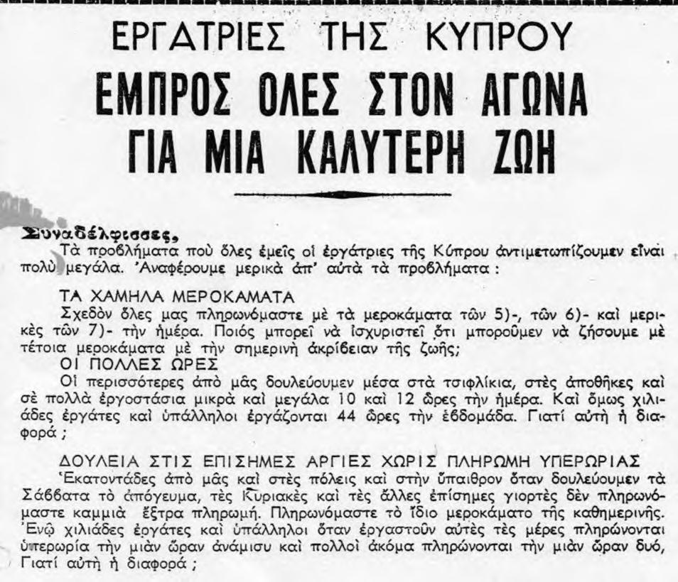 ΕΠΕΤΕΙΑΚΑ 4 ΕΡΓΑΤΙΚΟ ΒΗΜΑ | ΤΕΤΑΡΤΗ 21 ΔΕΚΕΜΒΡΙΟΥ 2022 Το Γραφείο Γυναικών πάλεψε και παλεύει για τα δικαιώματα των εργαζόμενων γυναικών - Αφίσες μέσα από το χρόνο που «ζωντανεύουν» τους αγώνες μας Επιμέλεια: Μαρί-Κωνστάνς Κωνσταντίνου Tο 1952 η ΠΕΟ στο 7ο Συνέδριό της αποφάσιζε την ίδρυση του Γραφείου Γυναικών Εργατοϋπαλλήλων που είχε ως στόχο την εξειδίκευση της δράσης της Ομοσπονδίας στα ειδικά προβλήματα που αφορούν τις εργάτριες, την καλύτερη επαφή των συντεχνιών με τις εργάτριες, τη διαφώτιση στην οργάνωση και κινητοποίησή τους Οι αγώνες αυτοί είναι η ιστορία μας και έχει καθήκον να διδάσκει τις νέες γενιές, τις νέες εργαζόμενες και να τις καθοδηγεί στους σημερινούς ταξικούς αγώνες Οφείλουμε στις πρωτοπόρες αγωνίστριες που τόλμησαν και σήκωσαν τον ήλιο ψηλά για ένα καλύτερο αύριο να μην ξεχνάμε πού βρισκόταν η γυναίκα και πού είναι σήμερα, συνεχίζουμε στον ίδιο δρόμο και καλούμαστε να εντείνουμε τον αγώνα ενάντια στην αδικία και την εκμετάλλευση ενός συστήματος που παράγει και αναπαράγει τις διακρίσεις και τις ανισότητες. 70 χρόνια ζωής και δράσης Γραφείου Γυναικών Εργατοϋπαλλήλων ΠΕΟ