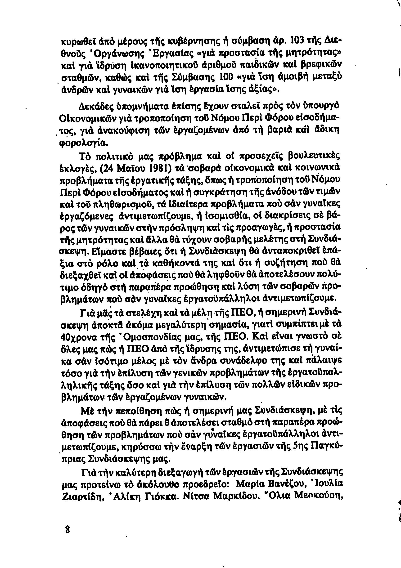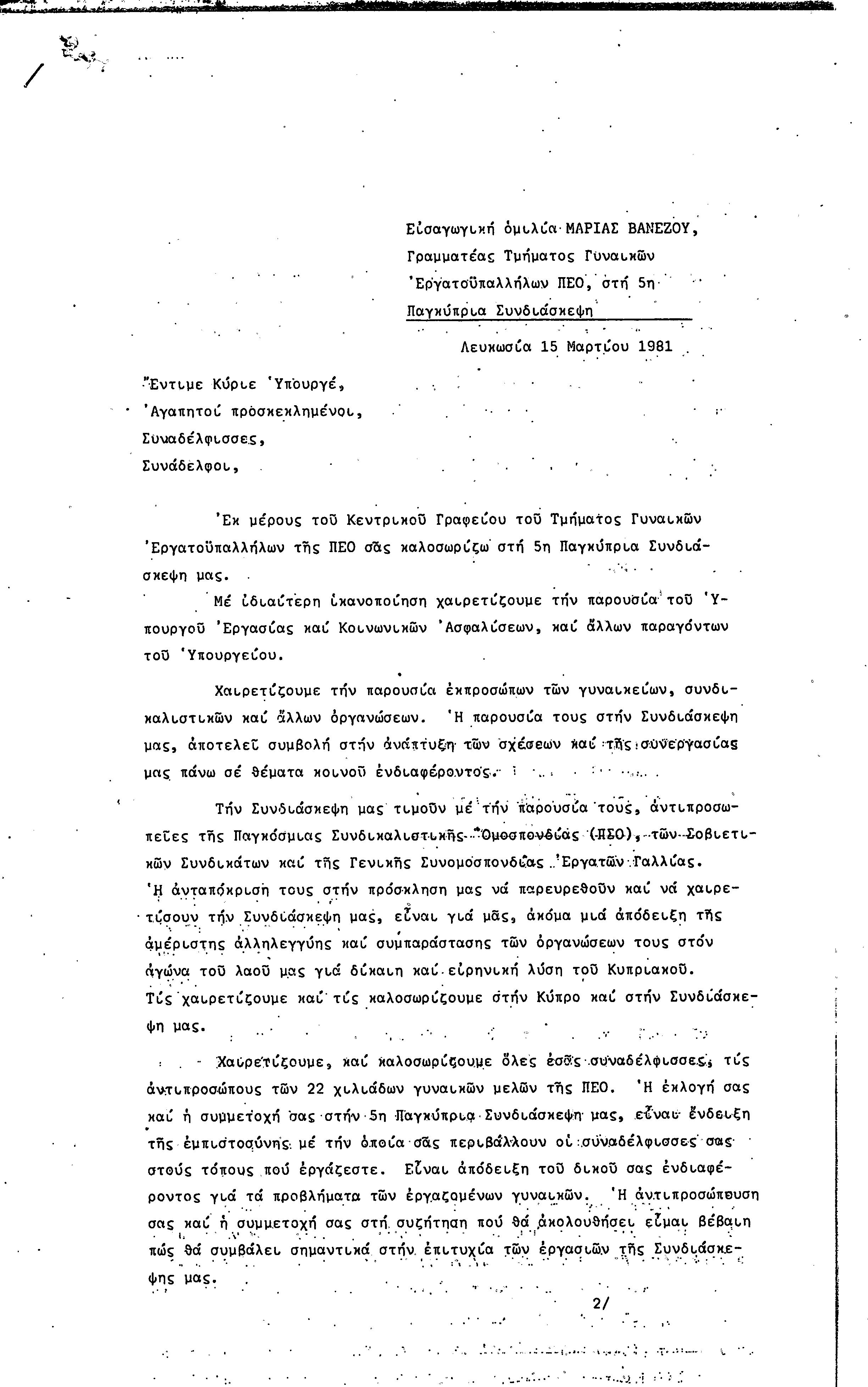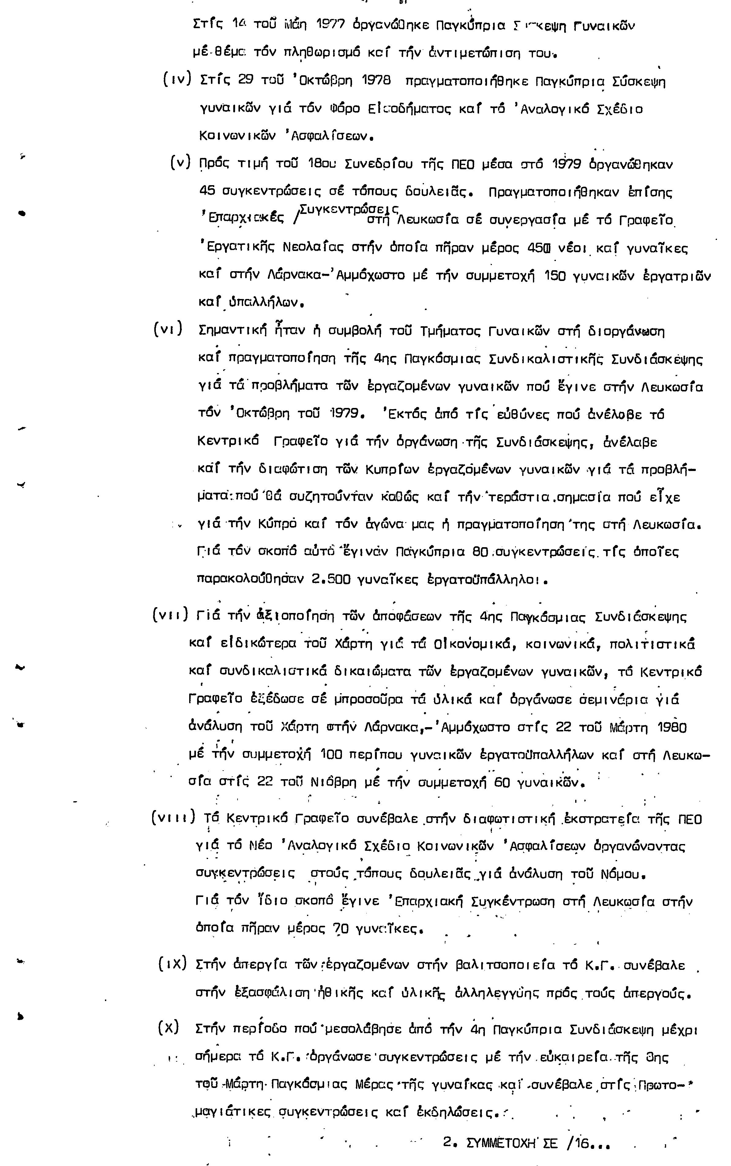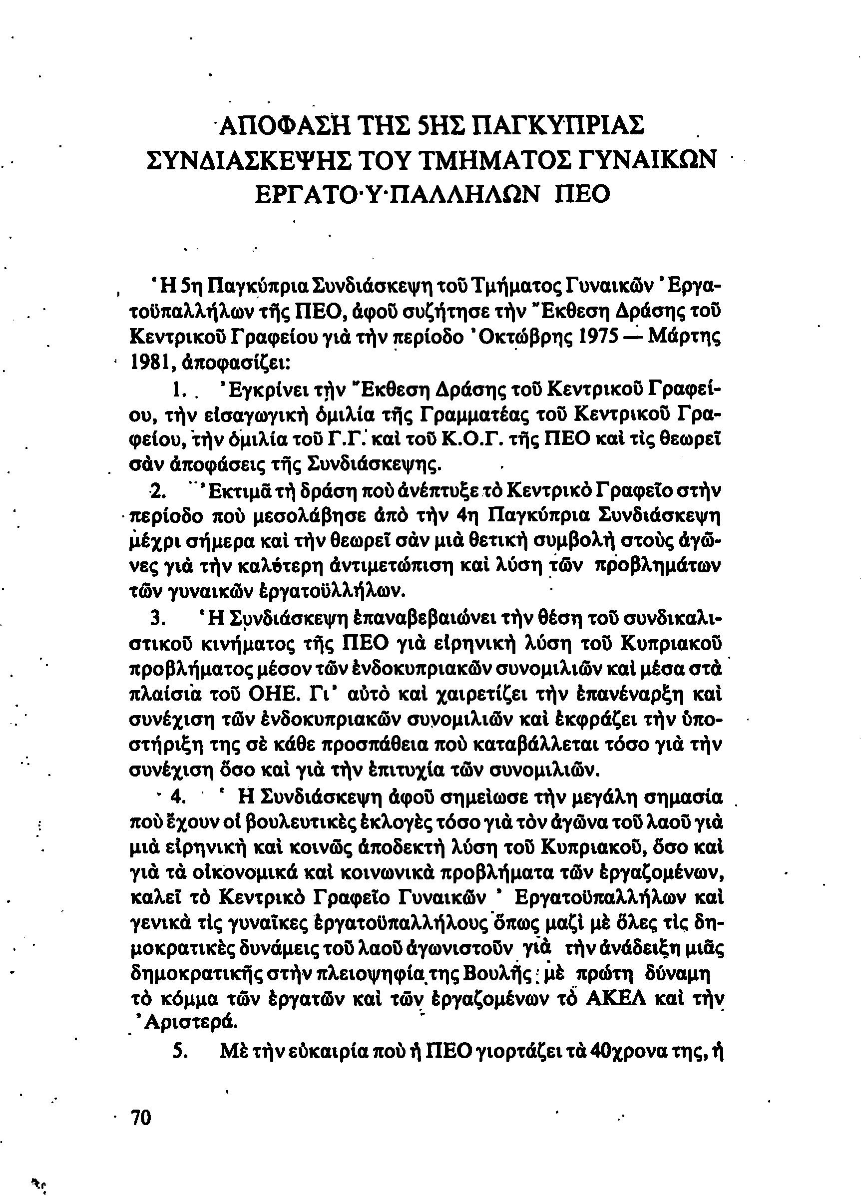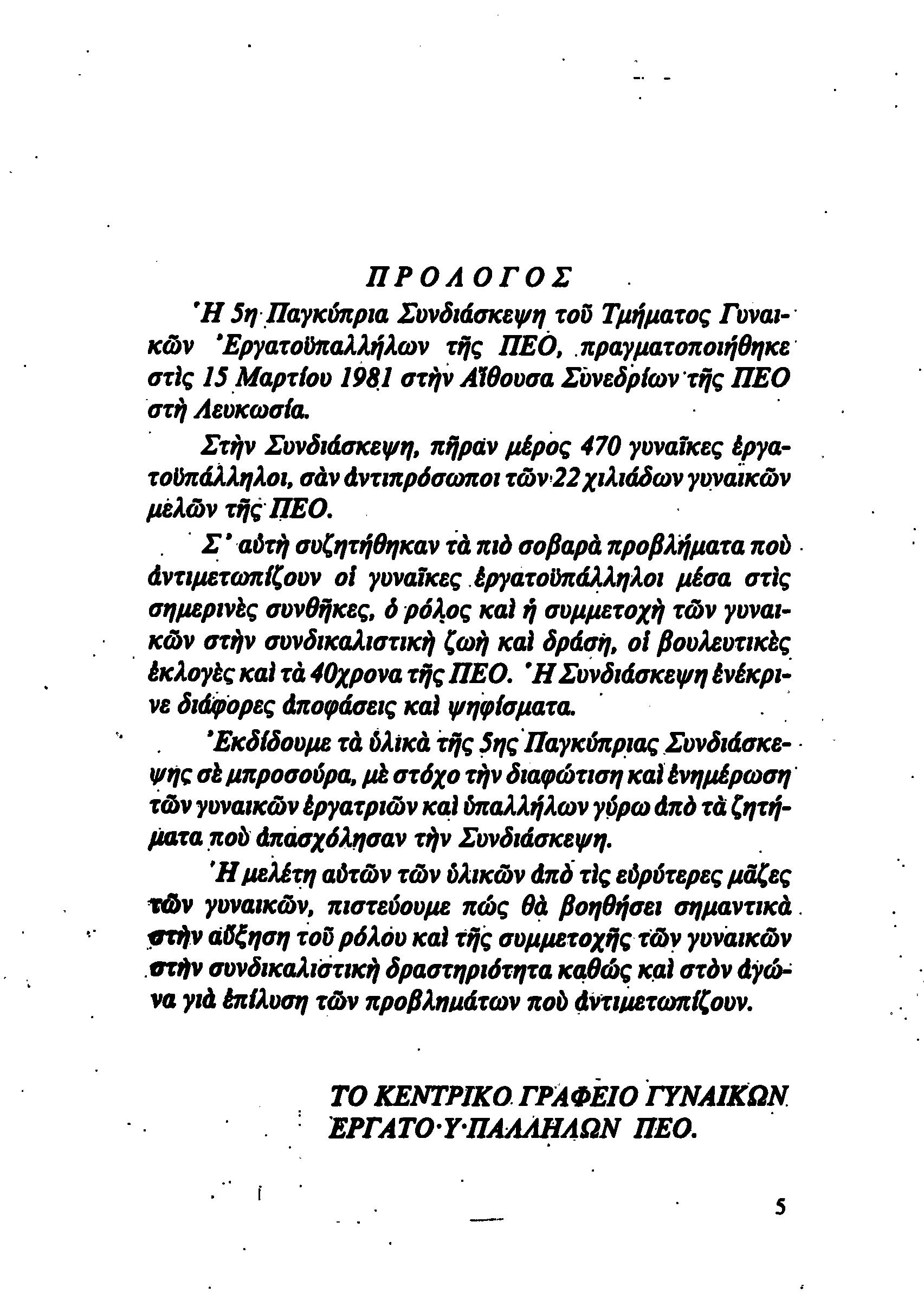 5η ΠΑΓΚΥΠΡΙΑ ΣΥΝΔΙΑΣΚΕΨΗ ΤΜΗΜΑΤΟΣ ΓΥΝΑΙΚΩΝ ΕΡΓΑΤΟΥΠΑΛΛΗΛΩΝ ΠΕΟ, 15.03.1981 ( ΕΚΘΕΣΗ ΔΡΑΣΗΣ ΟΚΤΩΒΡΗΣ