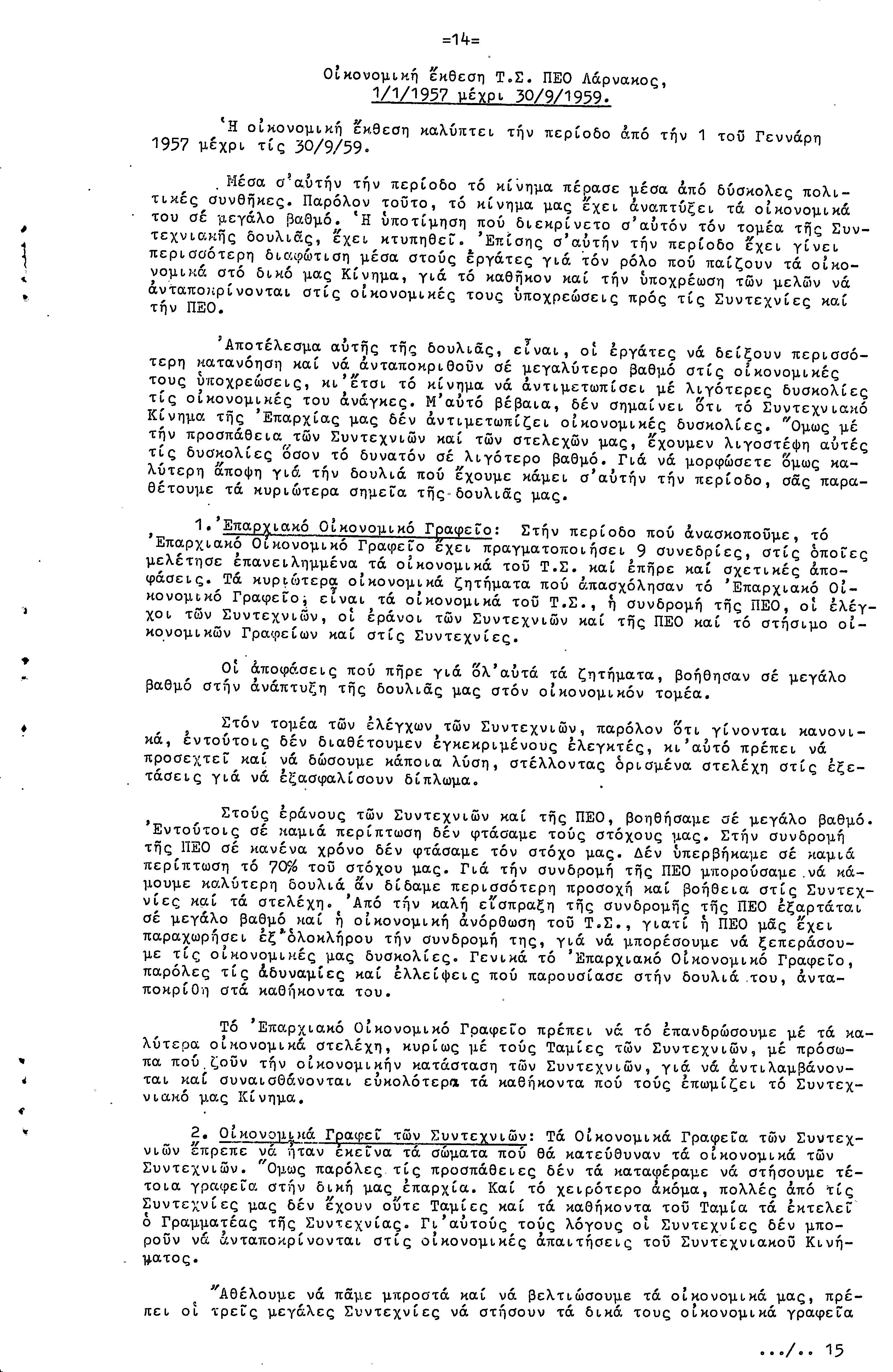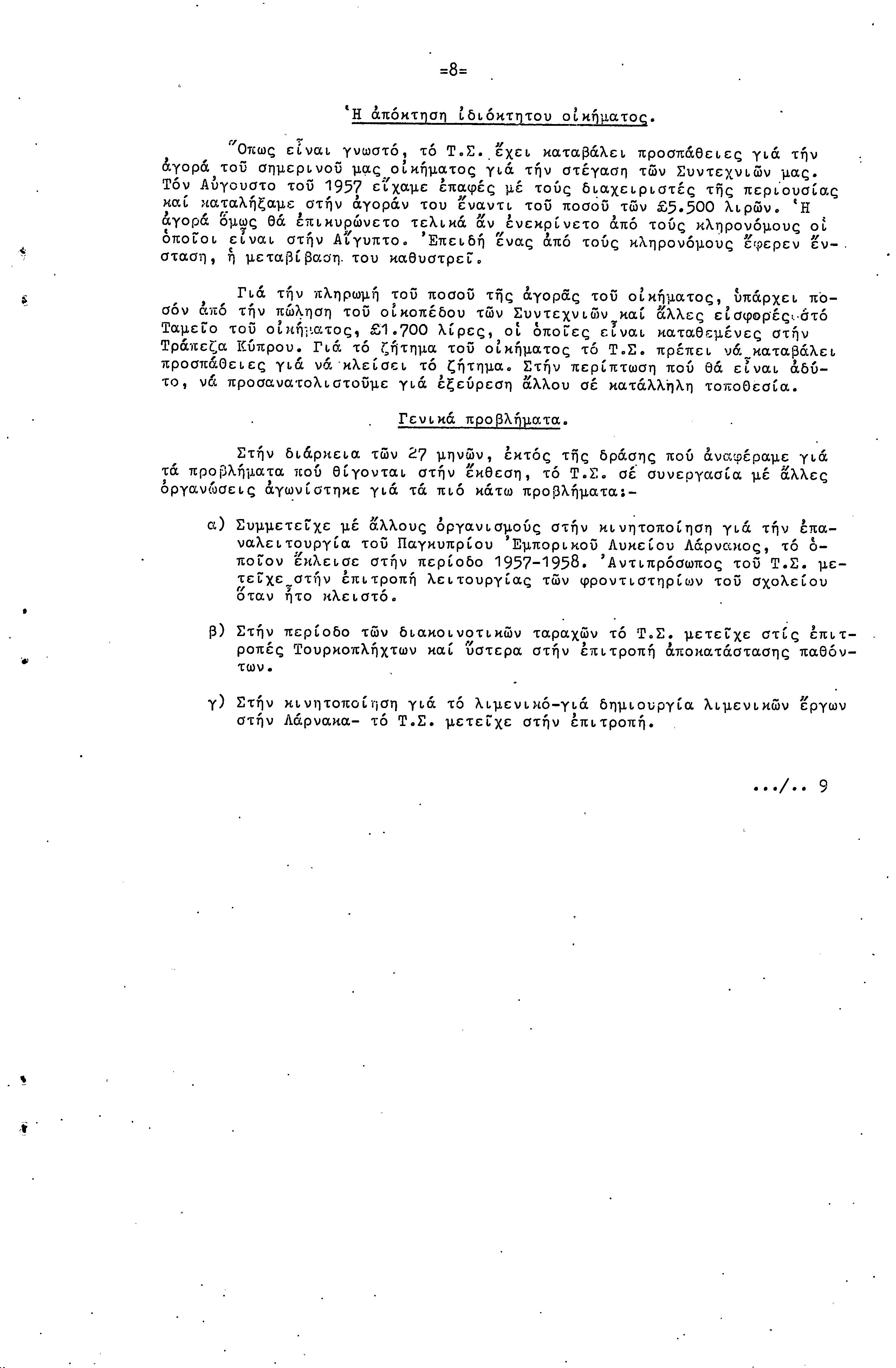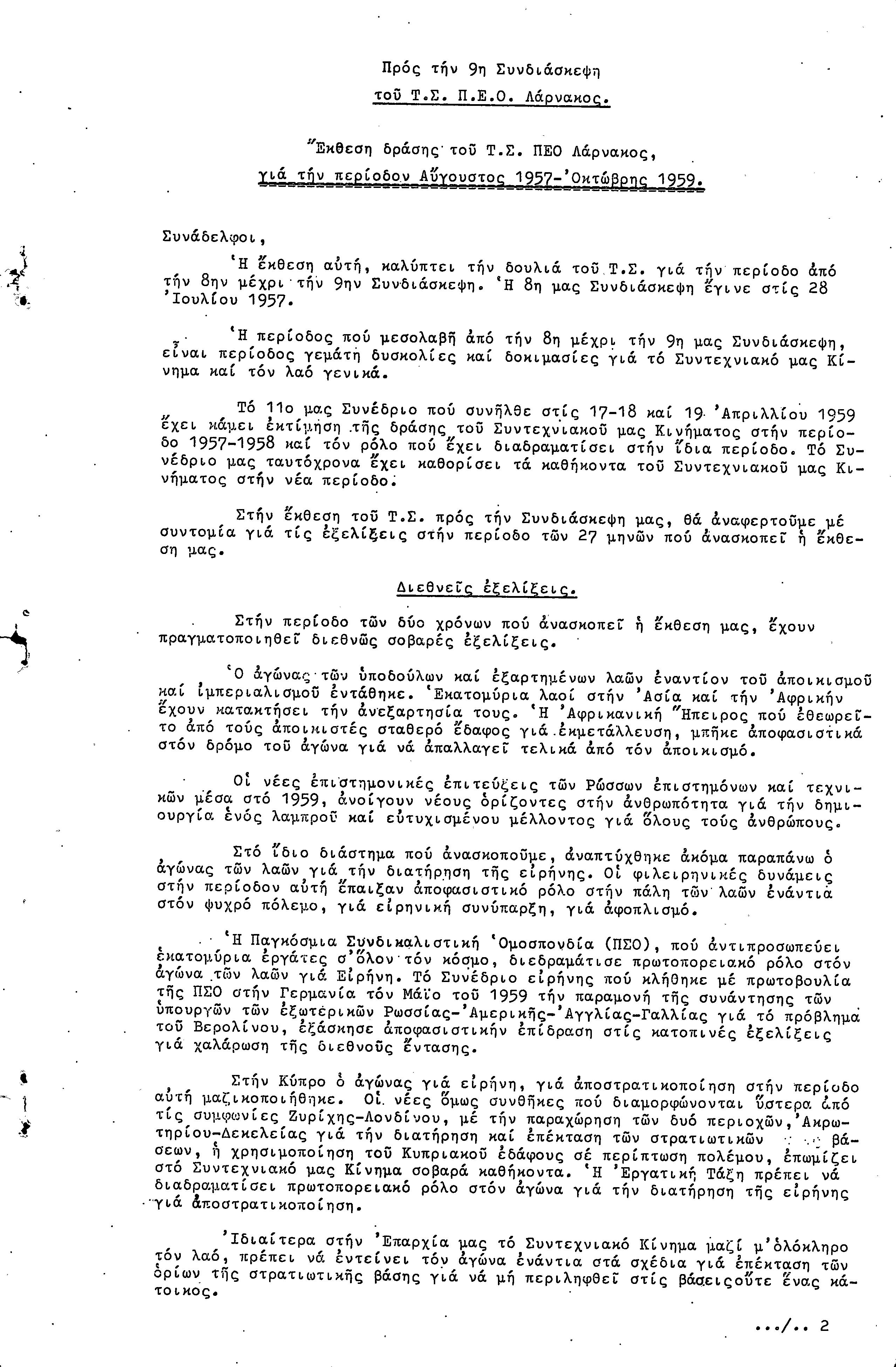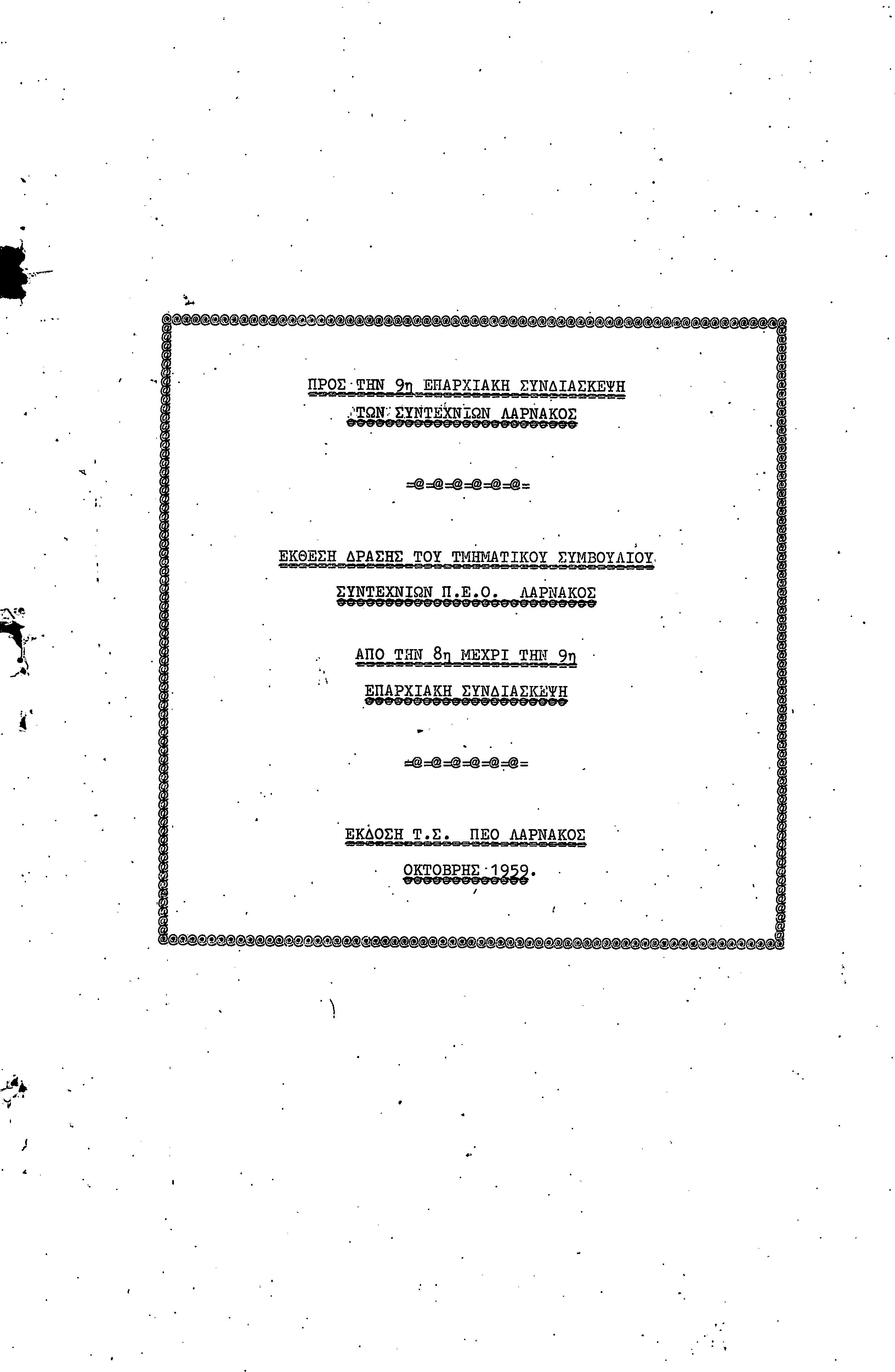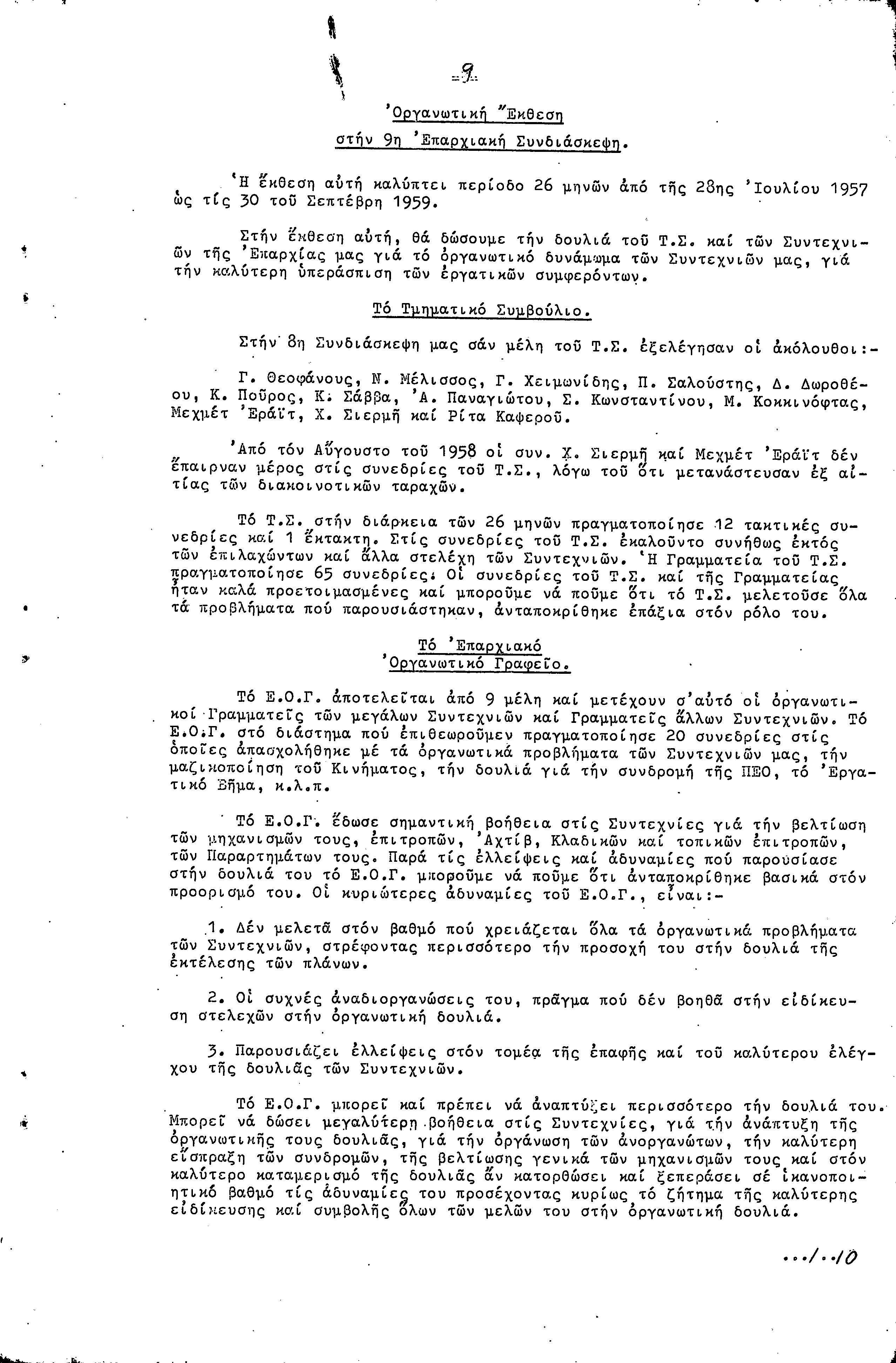 ΠΡΟΣ ΤΗΝ 9η ΕΠΑΡΧΙΑΚΗ ΣΥΝΔΙΑΣΚΕΨΗ Τ.Σ. ΠΕΟ ΛΑΡΝΑΚΑΣ, 10.1959 ( ΕΚΘΕΣΗ ΔΡΑΣΗΣ)