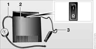 1. Screw hose 1 with manometer onto the tire valve. 2. Insert connector 3 into the lighter socket in the interior of the vehicle, page 81. 3. Switch on compressor 2. 4. Inflate the tire to at least 26psi/180kPa and at most 36psi/250kPa.