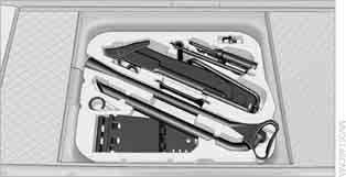 Your vehicle comes with an onboard vehicle tool kit that varies with the equipment version; it is stored underneath the flat load floor. > Mobility System with onboard vehicle tool kit and tire change set* 142 > Tire change set with onboard vehicle tool kit for space-saver spare tire 144