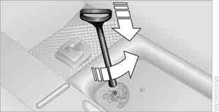 6. The space-saver spare tire is released and must be held by the lifting handle. 7. Lower the space-saver spare tire with the lifting handle. 8. Unscrew the lifting handle. 9. Pull the space-saver spare tire underneath the vehicle out toward the rear.