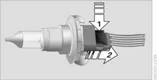 1. Squeeze clamping clips, arrows, and remove bulb holder. 2. Unscrew bulb counterclockwise and replace. 3. To insert the new bulb and bulb holder, proceed in reverse order. 4. Re-engage the bulb holder so that it audibly clicks into place. 1. Using a screwdriver, push the lamp to the left in the tab of the lamp housing, arrow 1. 2. Remove the lamp, arrow 2. 3. Replace the bulb. 4. Insert the lamp.