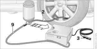 3 Holder for the sealant bottle 4 Compressor 5 Plug and cable for the socket in the vehicle interior, page 87 6 Connection hose to connect the compressor and sealant bottle or the compressor and wheel 7 On/off switch 8 Pressure gauge for indicating the tire inflation pressure 9 Release button for reducing the tire inflation pressure Connector, cable and connection hose are stored in the compressor housing.