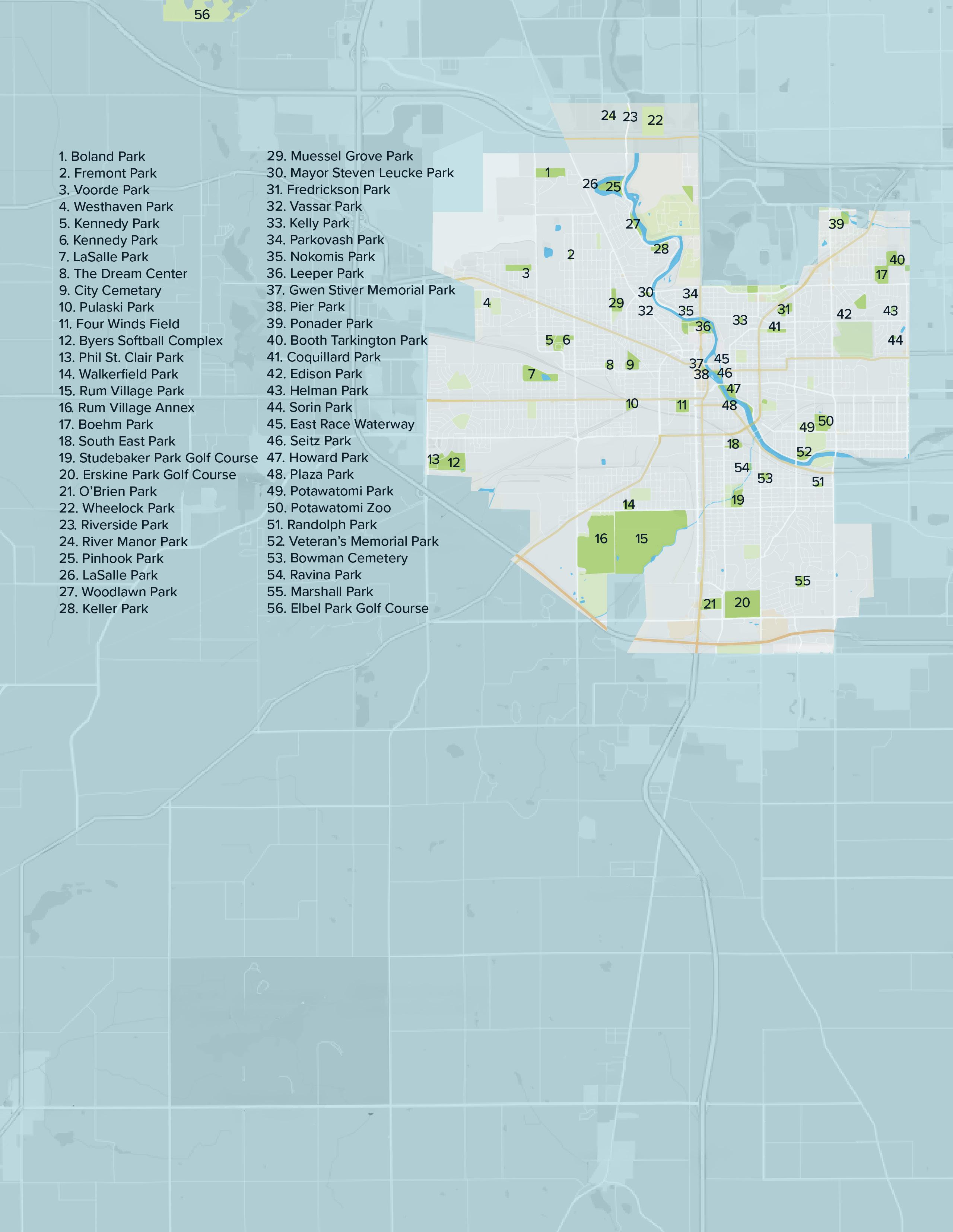Located at Boehm Park, Coquillard Park, Tarkington Park, and Leeper Park