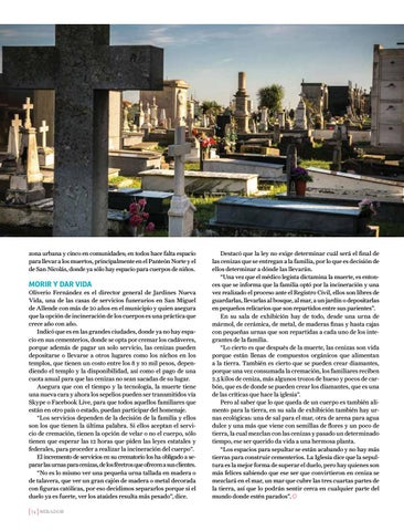MORIR Y DAR VIDA Oliverio Fernández es el director general de Jardines Nueva Vida, una de las casas de servicios funerarios en San Miguel de Allende con más de 20 años en el municipio y quien asegura que la opción de incineración de los cuerpos es una práctica que crece año con año. Indicó que es en las grandes ciudades, donde ya no hay espacio en sus cementerios, donde se opta por cremar los cadáveres, porque además de pagar un solo servicio, las cenizas pueden depositarse o llevarse a otros lugares como los nichos en los templos, que tienen un costo entre los 8 y 10 mil pesos, dependiendo el templo y la disponibilidad, así como el pago de una cuota anual para que las cenizas no sean sacadas de su lugar. Asegura que con el tiempo y la tecnología, la muerte tiene una nueva cara y ahora los sepelios pueden ser transmitidos vía Skype o Facebook Live, para que todos aquellos familiares que están en otro país o estado, puedan participar del homenaje. “Los servicios dependen de la decisión de la familia y ellos son los que tienen la última palabra. Si ellos aceptan el servicio de cremación, tienen la opción de velar o no el cuerpo, sólo tienen que esperar las 12 horas que piden las leyes estatales y federales, para proceder a realizar la incineración del cuerpo”. El incremento de servicios en su crematorio los ha obligado a separar las urnas para cenizas, de los féretros que ofrecen a sus clientes. “No es lo mismo ver una pequeña urna tallada en madera o de talavera, que ver un gran cajón de madera o metal decorada con figuras católicas, por eso decidimos separarlos porque si el duelo ya es fuerte, ver los ataúdes resulta más pesado”, dice. 74 MIRADOR