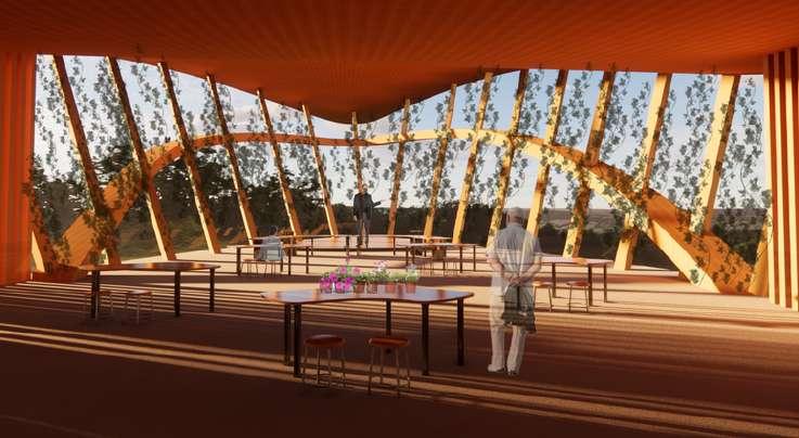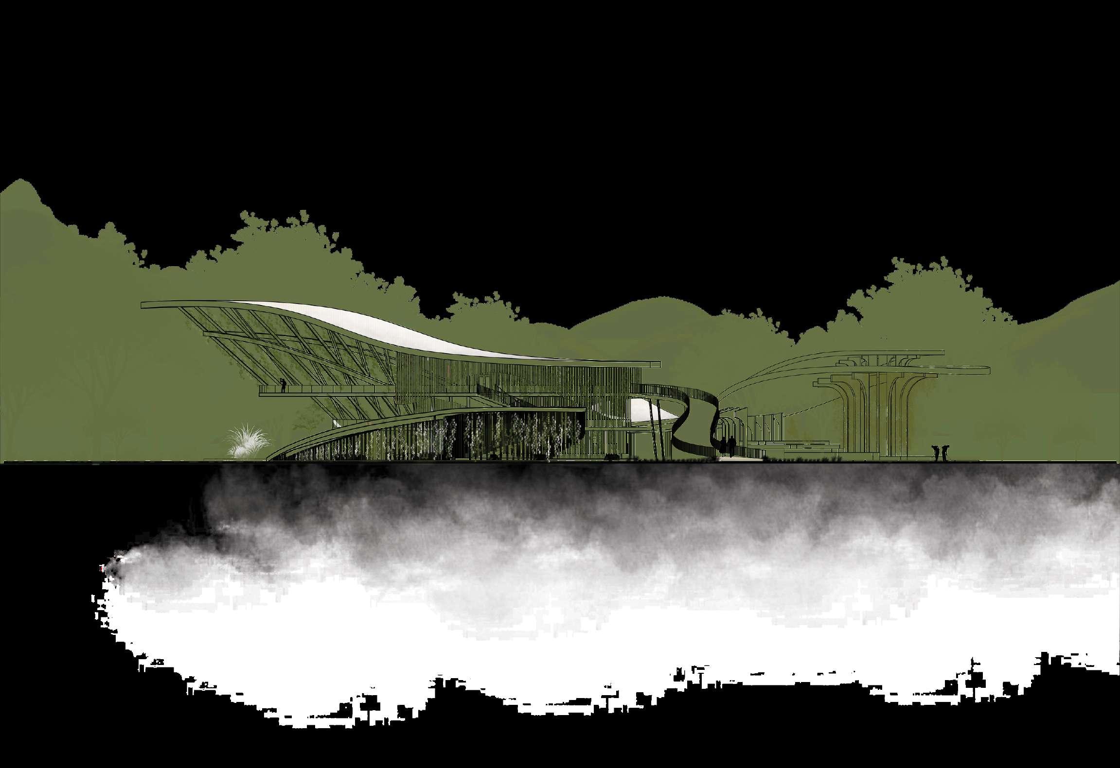 Insteadofdependingontangible rock,theBloomingNestdepends onthelake,andtheviewofthe laketotheheavensabove.A connectorbetweentheheavens andman,likeabird.