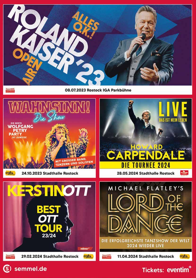 KAI40 18.00 ÜBER DEN DÄCHERN ROSTOCKS feiern auf dem Panorama Deck mit Ausblick über die Stadt. STADTHALLE 18.00 THE BJÖRN IDENTITY Tribute to ABBA in concert VOLKSTHEATER GROSSES HAUS 18.00 SILVESTERKONZERT Ludwig van Beethoven KÜSTENMÜHLE 19.00 SILVESTER Empfangsgetränk, Silvester buffet, DJ, Feuerwerk Mitter nachtssekt Eintritt: 130,00 € Erwachsene. 60,00 € Kinder (6-13,9 Jahre) KARLS ERLEBNIS-HOF 20.00 KARLS SILVESTERPARTY