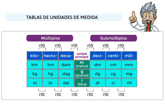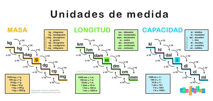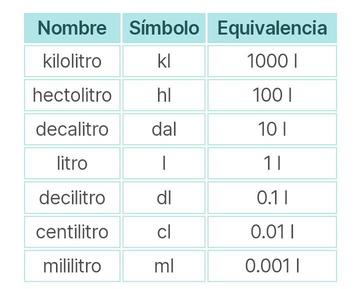Ejemplo: Para pasar de litro a centilitro bajamos 2 peldaños, por tanto, debemos multiplicar X10 y X10, es decir, multiplicaremos X100 (1 l = 100cl, 5l=500cl).