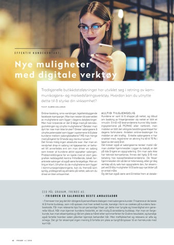 CEO PÅL GRAHAM, FRENDS AS: - FRISØREN ER SALONGENS BESTE AMBASSADØR - Fremover tror jeg det blir viktigere å personifisere dialogen med salongens kunder. Frisørene er de beste til å fronte budskap, som må spisses mot hver enkelt kunde, kanskje i form av cookies på kundens facebookside. Får man relevante tips fra sin personlige frisør, gir dette mer tyngde og troverdighet enn generelle tilbud. Når man kjenner kundens historikk, er det mulig å skreddersy budskap. Har man en fargekunde, kan man eksempelvis gi råd om pleie av håret etter sommerferien for å sikre resultatet, og kanskje også fortelle hvordan solen påvirker kjemisk behandlet hår. Men treffsikkerhet og relevans er alfa og omega. Det gir for eksempel ingen mening å fortelle om pleie av langthårspisser til en herrekunde med kort hår.