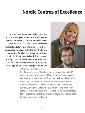 In 2007, NordForsk launched its most important funding instrument: the Nordic Centre of Excellence (NCoE) scheme. The objective of the NCoE model is to increase and facilitate 4 cooperation between outstanding researchers, researcher groups or institutions in the Nordic countries. An NCoE can operate as a virtual or physical centre and is headed by a project manager. Centre participants must come from at least three different Nordic countries and work together on research projects within the centre’s priority thematic area. Five Nordic Centres of Excellence were established in 2007 under two main programmes. Three of these centres were in the research area of food, nutrition and health and two in the area of welfare research. These programmes recently con cluded their periods, and the results of their activities are currently being evaluated. The evaluation is expected to be completed in spring 2014 and focuses both on how successful the collaboration model has proven to be, and on the research findings that it has produced.