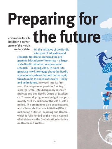 Preparing for the future «Education for all» has been a cornerstone of the Nordic welfare state. On the initiative of the Nordic ministers of education and research, NordForsk launched the pro gramme Education for Tomorrow – a largescale Nordic initiative on educational research – in spring 2013. The aim is to generate new knowledge about the Nordic educational systems that will better equip them to meet the needs of society – today and in the future. Now well into its first year, the programme provides funding to six large-scale, interdisciplinary research projects and one Nordic Centre of Excellence. The overall programme budget is approximately NOK 75 million for the 2012–2016 period. The programme also encompasses a smaller-scale thematic initiative (NOK 4 million) on Nutrition, Learning and Health, which is fully funded by the Nordic Council of Ministers via the Globalisation Initiative on Health and Welfare.