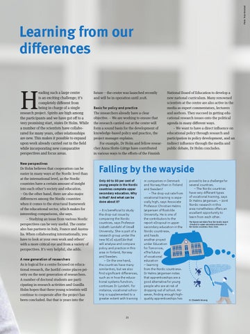 Falling by the wayside Only 60 to 80 per cent of young people in the Nordic countries complete upper secondary education. Why is that? And what can be done about it? – It is beneficial to study the drop-out issue by comparing the Nordic countries, says Professor Lisbeth Lundahl of Umeå University. She is part of a research group under the new NCoE «JustEd» that will analyse and compare policy and practice in this area in Finland, Norway and Sweden. – On the one hand, the countries have many similarities, but we also find significant differences, such as in how the educational systems function, continues Dr Lundahl. For instance, vocational schooling is supplemented to a greater extent with training