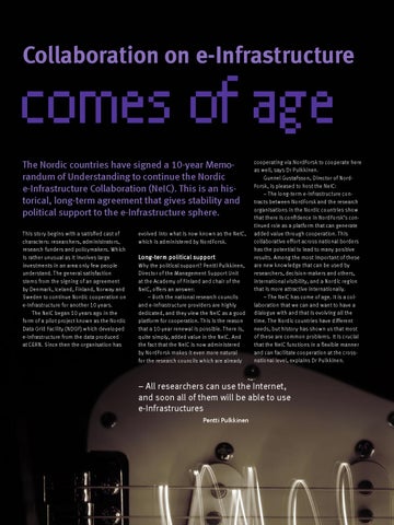 cooperating via NordForsk to cooperate here as well, says Dr Pulkkinen. Gunnel Gustafsson, Director of NordForsk, is pleased to host the NeIC: – The long-term e-Infrastructure con tracts between NordForsk and the research organisations in the Nordic countries show that there is confidence in NordForsk’s continued role as a platform that can generate added value through cooperation. This collaborative effort across national borders has the potential to lead to many positive results. Among the most important of these are new knowledge that can be used by researchers, decision-makers and others, international visibility, and a Nordic region that is more attractive internationally. – The NeIC has come of age. It is a collaboration that we can and want to have a dialogue with and that is evolving all the time. The Nordic countries have different needs, but history has shown us that most of these are common problems. It is crucial that the NeIC functions in a flexible manner and can facilitate cooperation at the crossnational level, explains Dr Pulkkinen.