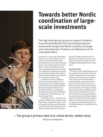 Towards better Nordic coordination of largescale investments The high-level advisory group on research infrastructures will assist NordForsk in prioritising long-term investments and give the Nordic countries a stronger voice internationally. Professor Lars Börjesson will be chairing the effort. Researchers in a wide range of disciplines need access to various infrastructures in order to generate high-quality results. Such infrastructures are costly to build and operate. Thus it makes good sense for the Nordic countries to pool their resources when investing in and using them. To this end, NordForsk has appointed an advisory group with representatives from national and international infrastructure communities and a broad scientific scope. In addition to chair Lars Börjesson (Sweden), the group comprises the following members: Peter Sloth (Denmark), Paula Eerola (Finland), Ingileif Jónsdóttir (Iceland), Solveig Flock (Norway), Vigdis Kvalheim (Norway), Juni Palmgren (Sweden), Hans Chang (The Netherlands), Steven Krauwer (The Netherlands), and Cherri Pancake (USA). Chair Börjesson says: – My aim for the group is to identify areas or infrastructures where Nordic coordination will be crucial to the quality and long-term development of research in the Nordic countries, and to propose initiatives that will best promote