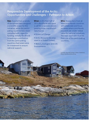 Responsible Development of the Arctic: Opportunities and Challenges – Pathways to Action How: Experts from a variety of disciplines have designed a scientific scope for the initiative, while the partici pating countries have been consulted with regard to funding. Initially NordForsk is seeking a contribution from the participating countries that totals twice its investment to ensure national support.